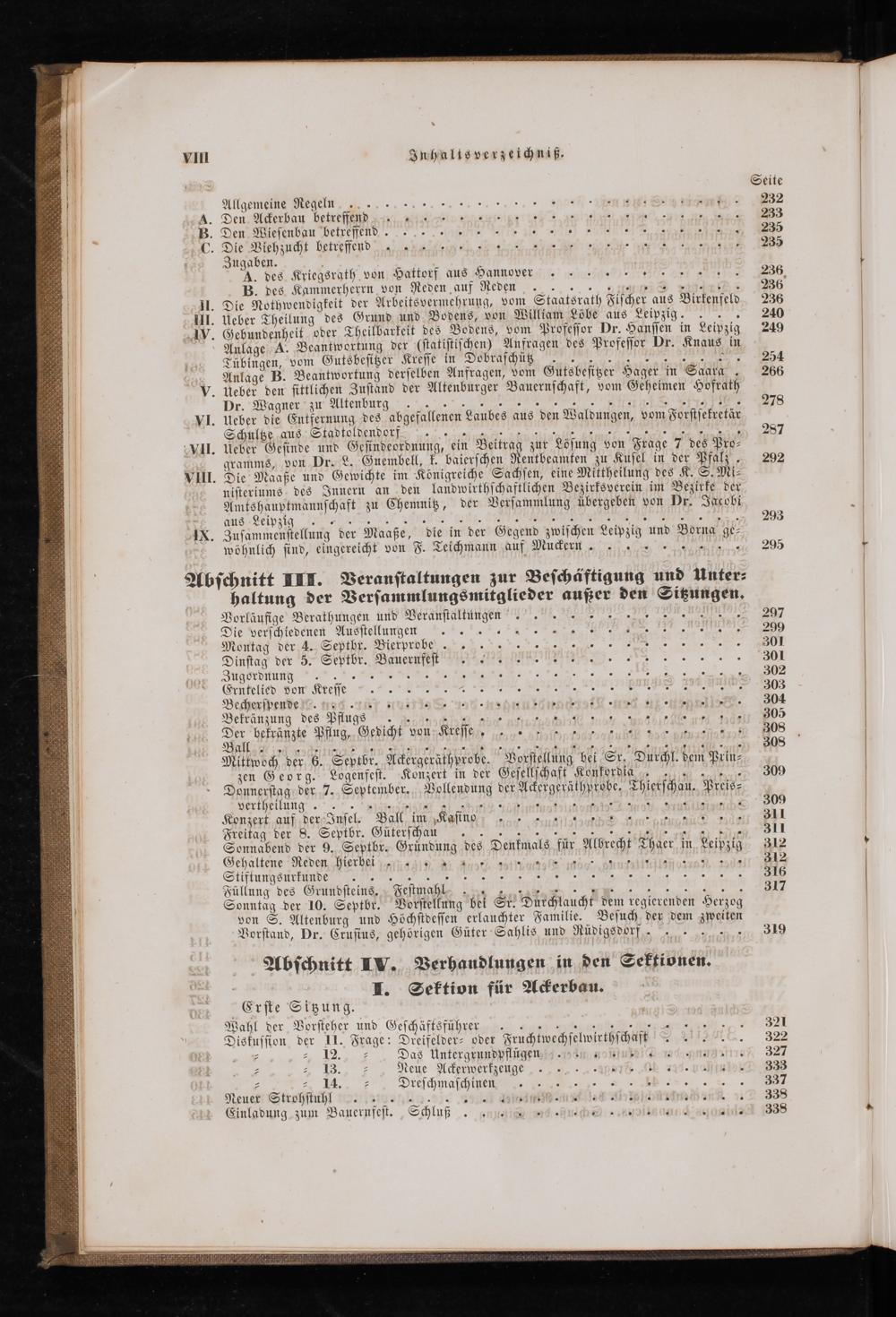 aus Leipag 293 IX. Zusammenstellung der Maaße, die in der Gegend zwischen Leipzig und Borng ge⸗ wöhnlich sind, eingereicht von F. Teichmann auf Muckern 25 Abschnitt III. Veranstaltungen zur Beschäftigung und Unter⸗ haltung der Versammlungsmitglieder außer den Sitzungen. Vorläufige Berathungen und Veranstaltunghen A. 297 Die verschiedenen Ausstellungen 299 Moutag der 4. Septhn Dierdroh n 301 Dinstag der 5. Septbr. Bauernfessststit 301 Zugordnung
