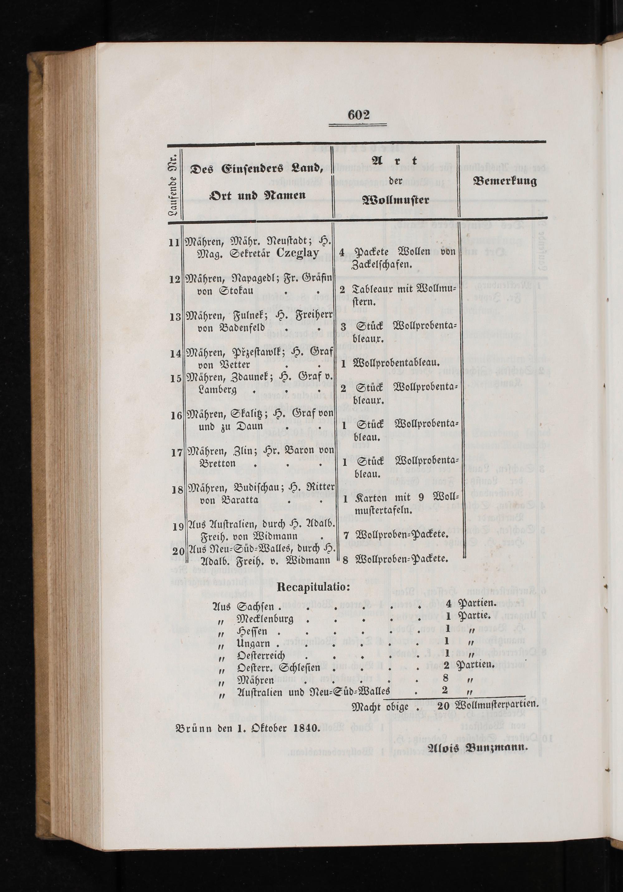 Macht obige 20 Wollmusterpartien. Brünn den 1. Oktober 1840.