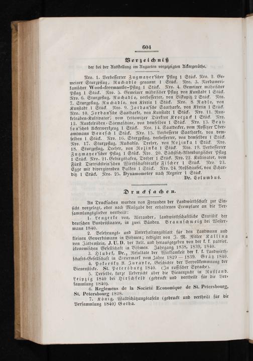 Nro. 1. Verbesserter Zugmayer'scher Pflug 1 Stück. Nro. 2. Ge— meiner Sturzpflug, Ruchadlo genannt 1 Stück. Nro. 3. Nordameri— kanischer Wood-fréemantle-Pflug 1 Stück. Nro. 4. Gemeiner mährischer Pflug 1 Stück. Nro. 5. Gemeiner mährischer Pflug von Kunstadt 1 Stück. Nro. 6. Sturzpflug, Ruchadlho, verbesserter, von Biskupitz 2 Stück. Nro. 7. Sturzpflug, Ruchadlo, von Kretin 1 Stück. Nro. 8. Radlo, von Kunstadt 1 Stück. Nro. 9. Jordan'sche Saatharke, von Kretin 1 Stück. Nro. 10. Jordan'sche Saatharke, von Kunstadt 1 Stück. Nro. 11. Run⸗ kelrüben-Kultivator, vom Lettowitzer Direktor Kroczack 1 Stück. Nro. 12. Runkelrüben-Säemaschine, von demselben 1 Stück. Nro. 13. Besat— so n'sches Ackerwerkzeug 1 Stück. Nro. 14. Saatdecker, vom Rossitzer Ober⸗ amtmann Benesch 1 Stück. Nro. 15. Verbesserte Saatharke, von dem— selben 1 Stück. Nro. 16. Sturzpflug, verbesserter, von demselben 1 Stück. Nro. 17. Sturzpflug, Ruchadlo, Dreher, von Rozinka 1 Stück. Nro. 18. Sturzpflug, Dreher, von Rozinka 1 Stück. Nro. 19. Verbesserter Zugmayer'scher Pflug 1 Stück. Nro. 20. Sächsisch-Altenburgischer Pflug 1 Stück. Nro. 21. Gebirgshaken, Dreher 1 Stück. Nro. 22. Kultivator, vom Fürst Dietrichstein'schen Wirthschaftsrathe Fischer 1 Stück. Nro. 23. Egge mit divergirenden Balken 1 Stück. Nro. 24. Roßschaufel, von Schar⸗ ditz 1 Stück. Nro. 25. Dynamometer nach Regnier 1 Stück.