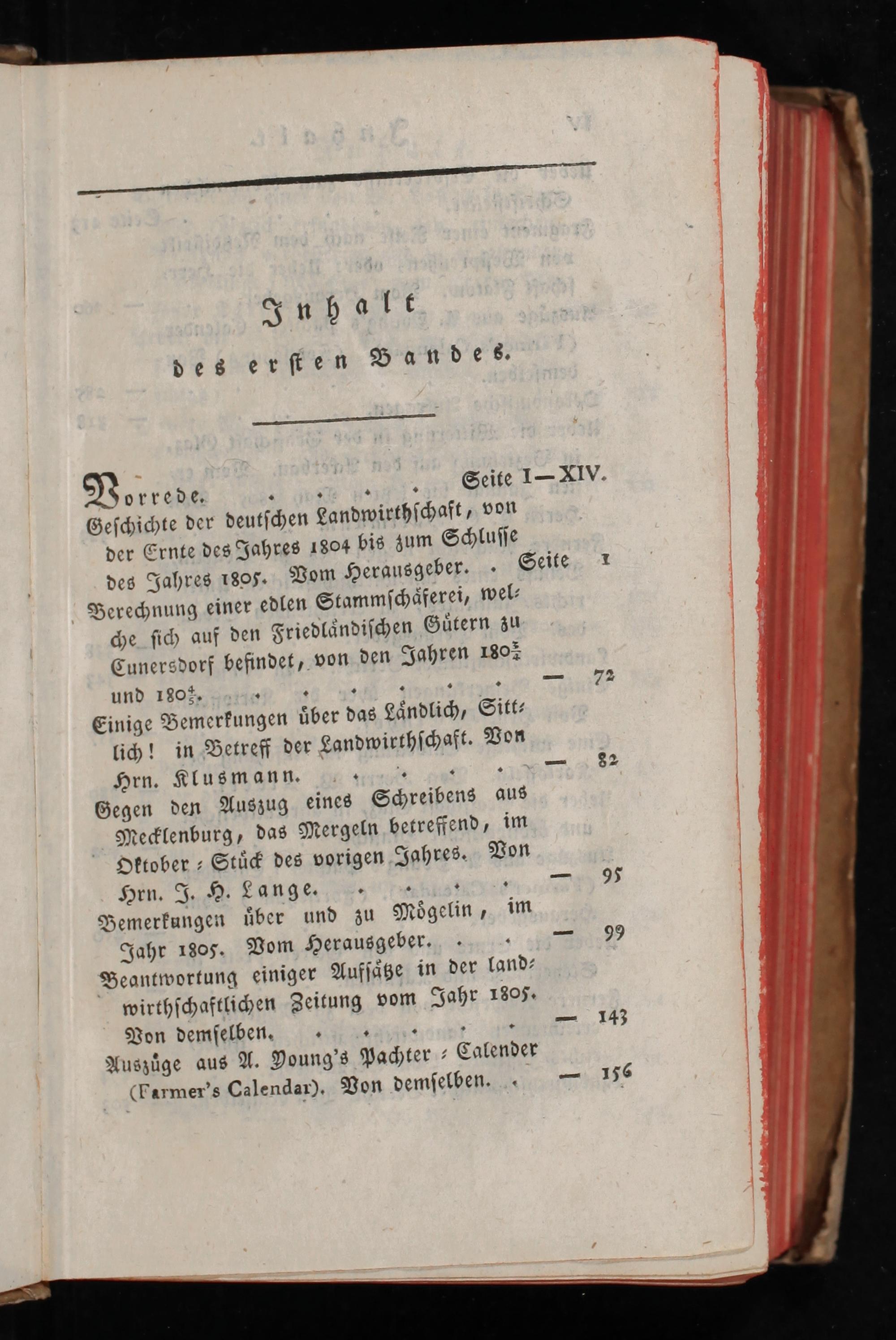 Vorrede..... Seite 1— XIV. Geſchichte der deutſchen Landwirthſchaft, von der Ernte des Jahres 1804 bis zum Schluſſe des Jahres 1805. Vom Herausgeber.. Seite 1 Berechnung einer edlen Stammſſchaͤferei, wel⸗ che ſich auf den Friedlaͤndiſchen Guͤtern zu Cunersdorf befindet, von den Jahren 180 und 180 ½.......— Einige Bemerkungen aͤber das Laͤndlich, Sitt⸗ lich! in Betreff der Landwirthſchaft. Von Hrn. Klusmann....— 82 Gegen den Auszug eines Schreibens aus Mecklenburg, das Mergeln betreffend, im Oktober⸗Stuͤck des vorigen Jahres. Von Hrn. J. H. Lange..„. 3 Bemerkungen uͤber und zu Moͤgelin, im Jahr 1805. Vom Herausgeber...— 99 Beantwortung einiger Aufſaͤtze in der land⸗ wirthſchaftlichen Zeitung vom Jahr 1805. Von demſelben......— 143 Auszuͤge aus A. Young's Pachter⸗Calender (Farmer's Calendar). Von demſelben.— 156