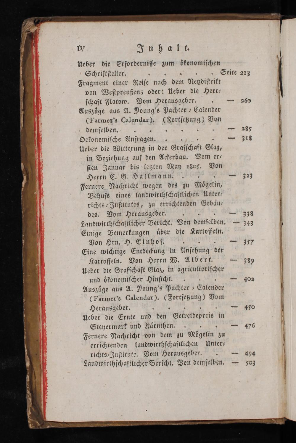 Ueber die Erforderniſſe zum oͤkonomiſchen Schriftſteller...... Seite 213 Fragment einer Reiſe nach dem Netzdiſtrikt von Weſtpreußen; oder: Ueber die Herr⸗ ſchaft Flatow. Vom Herausgeber..— 260 Auszuͤge aus A. Young's Pachter⸗Calender (Farmer's Calendar).(Fortſetzung) Von demfelben.......— 285 Oekonomiſche Anfragen....— 318 Ueber die Witterung in der Grafſchaft Glaz, in Beziehung auf den Ackerbau. Vom er⸗ ſten Januar bis letzten May 1805. Von Herrn C. G. Hallmann...— 323 Fernere Nachricht wegen des zu Mögelin, Behufs eines landwirthſchaftlichen Unter⸗ richts⸗Inſtitutes, zu errichtenden Gebaͤu des. Vom Herausgeber..— 338 Landwirthſchaftlicher Bericht. Von demſelben.— 343 Einige Bemerkungen uͤber die Kartoffeln.