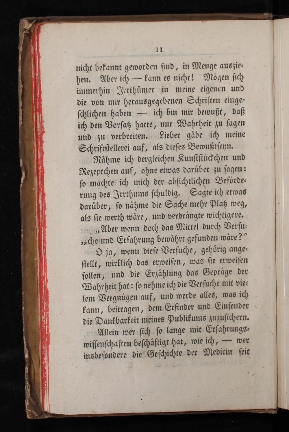 nicht bekannt geworden ſind, in Menge auszie⸗ hen. Aber ich— kann es nicht! Mogen ſich immerhin Jerthuͤmer in meine eigenen und die von mir herausgegebenen Schriſten einge⸗ ſchlichen haben— ich bin mir bewußt, daß ich den Vorſatz hatte, nur Wahrheit zu ſagen und zu verbreiten. Lieber gaͤbe ich meine Schriftſtellerei auf, als dieſes Bewußtſeyn. Nähme ich dergleichen Kunſtſtuͤckchen und Rezeptchen auf, ohne etwas daruͤber zu ſagen: ſo machte ich mich der abſichtlichen Befoͤrde⸗ rung des Irrthums ſchuldig. Sagte ich etwas daruͤber, ſo naͤhme die Sache mehr Platz weg, als ſie werth wäͤre, und verdraͤngte wichtigere. „Aber wenn doch das Mittel durch Verſu⸗ „zche und Erfahrung bewäͤhrt gefunden waͤre?“ O ja, wenn dieſe Verſuche, gehoͤrig ange— ſtellt, wirklich das erweiſen, was ſie erweiſen ſollen, und die Erzaͤhlung das Gepraͤge der Wahrheit hat: ſo nehme ich die Verſuche mit vie⸗ lem Vergnuͤgen auf, und werde alles, was ich kann, beitragen, dem Erfinder und Einſender die Dankbarkeit meines Publikums zuzuſichern. Allein wer ſich ſo lange mit Erfahrungs⸗ wiſſenſchaften beſchaͤftigt hat, wie ich,— wer insbeſondere die Geſchichte der Medicin ſeit