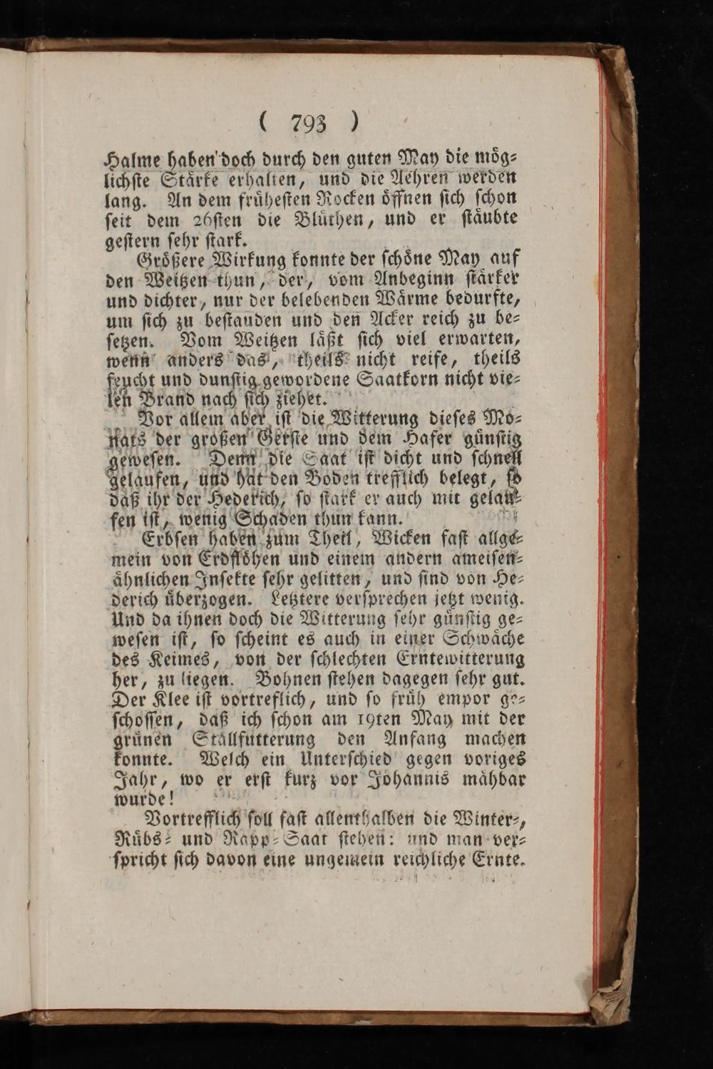 Erbſen haben zum Theil, Wicken faſt allge⸗ mein von Erdfloͤhen und einem andern ameiſen⸗ aͤhnlichen Inſekte ſehr gelitten, und ſind von He⸗ derich uͤberzogen. Letztere verſprechen jetzt wenig. Und da ihnen doch die Witterung ſehr guͤnſtig ge⸗ weſen iſt, ſo ſcheint es auch in einer Schwaͤche des Keimes, von der ſchlechten Erntewitterung her, zu liegen. Bohnen ſtehen dagegen ſehr gut. Der Klee iſt vortreflich, und ſo fruͤh empor ge⸗ ſchoſſen, daß ich ſchon am 19ten May mit der gruͤnen Staͤllfutterung den Anfang machen konnte. Welch ein Unterſchied gegen voriges Jahr, wo er erſt kurz vor Johannis maͤhdar wurde!
