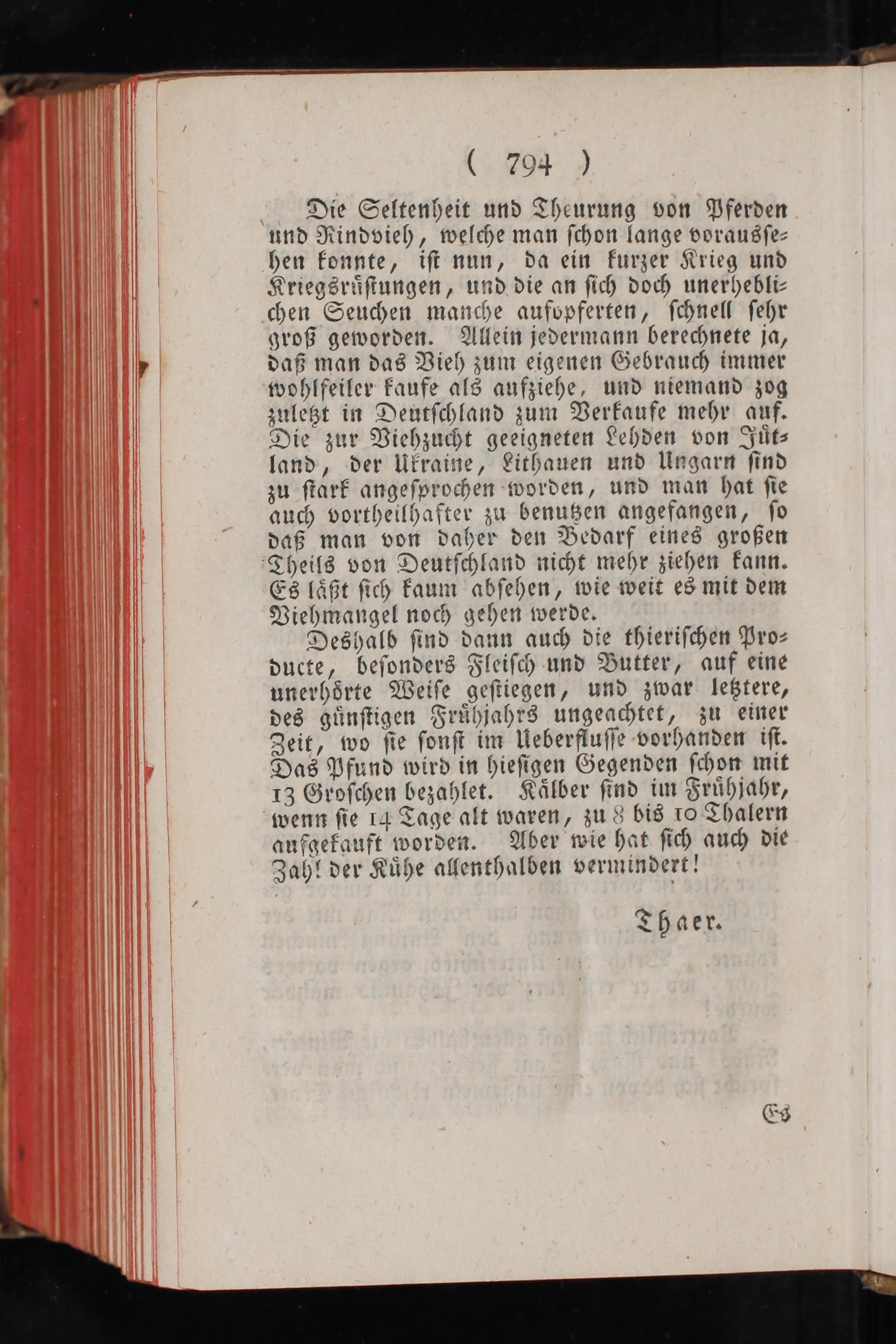 Deshalb ſind dann auch die thieriſchen Pro⸗ ducte, beſonders Fleiſch und Butter, auf eine unerhoͤrte Weiſe geſtiegen, und zwar letztere, des guͤnſtigen Fruͤhjahrs ungeachtet, zu einer Zeit, wo ſie ſonſt im Ueberfluſſe vorhanden iſt. Das Pfund wird in hieſigen Gegenden ſchon mit 13 Groſchen bezahlet. Kaͤlber ſind im Fruͤhjahr, wenn ſie 14 Tage alt waren, zu 8 bis 10 Thalern aufgekauft worden. Aber wie hat ſich auch die Zahl der Kuͤhe allenthalben vermindert!