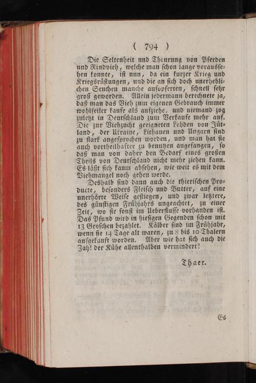 Die Seltenheit und Theurung von Pferden und Rindvieh, welche man ſchon lange vorausſe⸗ hen konnte, iſt nun, da ein kurzer Krieg und Kriegsruͤſtungen, und die an ſich doch unerhebli⸗ chen Seuchen manche auſopferten, ſchnell ſehr groß geworden. Allein jedermann berechnete ja, daß man das Vieh zum eigenen Gebrauch immer wohlfeiler kaufe als aufziehe, und niemand zog zuletzt in Deutſchland zum Verkaufe mehr auf. Die zur Viehzucht geeigneten Lehden von Juͤt⸗ land, der Ukraine, Lithauen und Ungarn ſind zu ſtark angeſprochen worden, und man hat ſie auch vortheilhafter zu benutzen angefangen, ſo daß man von daher den Bedarf eines großen Theils von Deutſchland nicht mehr ziehen kann. Es laͤßt ſich kaum abſehen, wie weit es mit dem Viehmangel noch gehen werde.