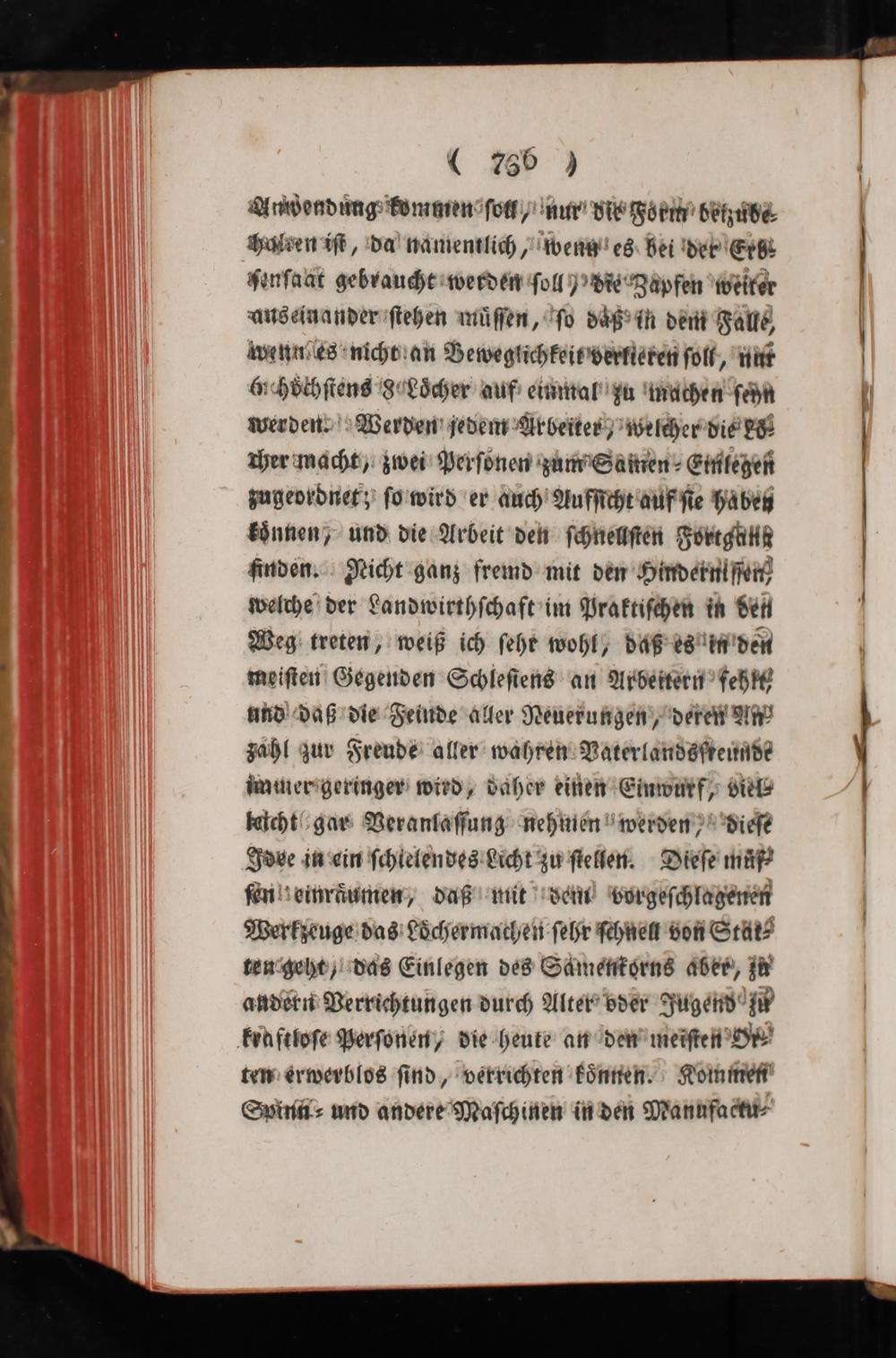 Amdendung kommen ſoll, nur die Form betzube⸗ holren iſt, da namieentlich, weng es bei der Erb ſenſaat gebraucht werden ſoll) die Zapfen weirer auseinander ſtehen muͤſſen, ſo daͤß in dem Fallé, wennes nicht an Beweglichkeit verlieren ſoll, unt üichoͤchſtens§8 Loͤcher auf einmal zu machen ſehn werden. Werden jedem Arbeiter, welcher die 26. wher macht, zwei Perſonen zum Sainen⸗Einlegen zugeordnet; ſo wird er auch Aufſicht auf ſie haͤben koͤnnen, und die Arbeit den ſchnellſten Fortgant finden. Nicht ganz fremd mit den Hinderniſſen welche der Landwirthſchaft im Praktiſchen in den Weg treten, weiß ich ſehr wohl, daß es in den meiſten Gegenden Schleſtens an Arbeitern fehlt, und daß die Feinde aller Neuerungen, deren And zahl zur Freude aller wahren Vaterlandsfreunde immer geringer wird, daher einen Einwurf, viel⸗ keicht gar Veranlaſſung nehmen werden, dieſe Idre in ein ſchielendes Licht zu ſtellen. Dieſe muͤf⸗ ſen einraͤumen, daß mit dem vorgeſchlagenen Werkzeuge das Loͤchermachen ſehr ſchnell von Stats⸗ ten geht, das Einlegen des Samenkorns aber, zu andern Verrichtungen durch Alter oder Jugend zu kraftloſe Perſonen, die heute an den meiſten Ore ten erwerblos ſind, verrichten koͤnnen. Kommen Spinn⸗ und andere Maſchinen in den Manufactu⸗