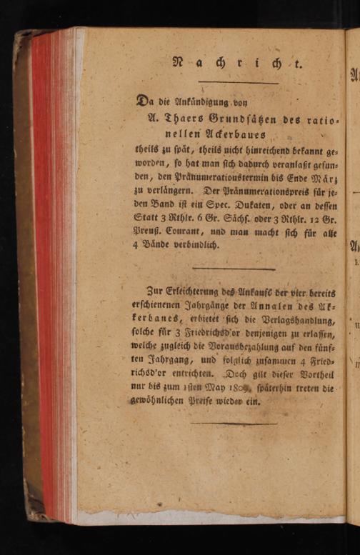 Zur Erleichterung des Ankauſe der vier bereits erſchienenen Jahrgaͤnge der Annalen des Ak⸗ kerbanes, erbietet ſich die Verlagshandlung, ſolche fuͤr 3 Friedrichsd'or denjenigen zu erlaſſen, welche zugleich die Vorausbezahlung auf den fuͤnf⸗ ten Jahrgang, und folglich zuſammen 4 Fried⸗ richsd'or entrichten. Doch gilt dieſer Vortheil nur bis zum iſten May 1808%, ſpaͤterhin treten die gewoͤhnlichen Preiſe wieder ein.