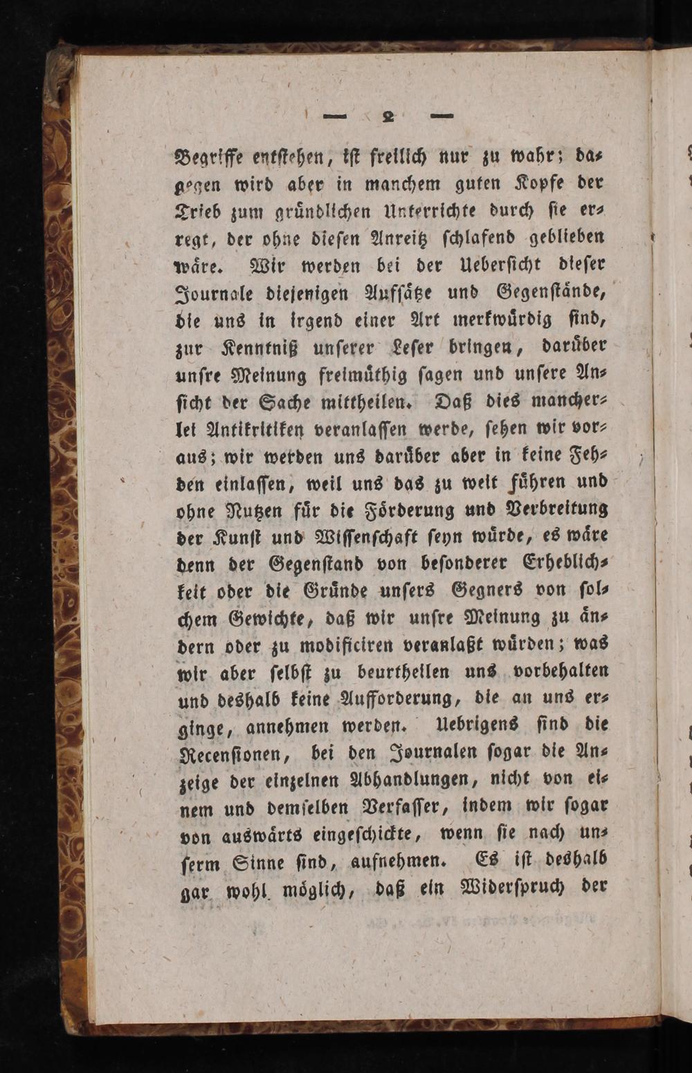 Begriffe entſtehen, iſt freillich nur zu wahr; da⸗ gegen wird aber in manchem guten Kopfe der Trieb zum gruͤndlichen Unterrichte durch ſie er⸗ regt, der ohne dieſen Anreitz ſchlafend geblieben waͤre. Wir werden bei der Ueberſicht dieſer Journale diejenigen Aufſaͤtze und Gegenſtaͤnde, die uns in irgend einer Art merkwuͤrdig find, zur Kenntniß unſerer Leſer bringen, daruͤber unſre Meinung freimuͤthig ſagen und unſere An⸗ ſicht der Sache mittheilen. Daß dies mancher⸗ lei Antikritiken veranlaſſen werde, ſehen wir vor⸗ aus; wir werden uns daruͤber aber in keine Feh⸗ den einlaſſen, weil uns das zu weit fuͤhren und ohne Nutzen fuͤr die Foͤrderung und Verbreitung der Kunſt und Wiſſenſchaft ſeyn wuͤrde, es waͤre denn der Gegenſtand von beſonderer Erheblich⸗ keit oder die Gruͤnde unſers Gegners von ſol⸗ chem Gewichte, daß wir unſre Meinung zu aͤn⸗ dern oder zu modificiren veranlaßt wuͤrden; was wir aber ſelbſt zu beurtheilen uns vorbehalten und deshalb keine Aufforderung, die an uns er⸗ ginge, annehmen werden. Uebrigens ſind die Recenſionen, bei den Journalen ſogar die An⸗ zeige der einzelnen Abhandlungen, nicht von ei⸗ nem und demſelben Verfaſſer, indem wir ſogar von auswaͤrts eingeſchickte, wenn ſie nach un⸗ ſerm Sinne ſind, aufnehmen. Es iſt deshalb gar wohl moͤglich, daß ein Widerſpruch der