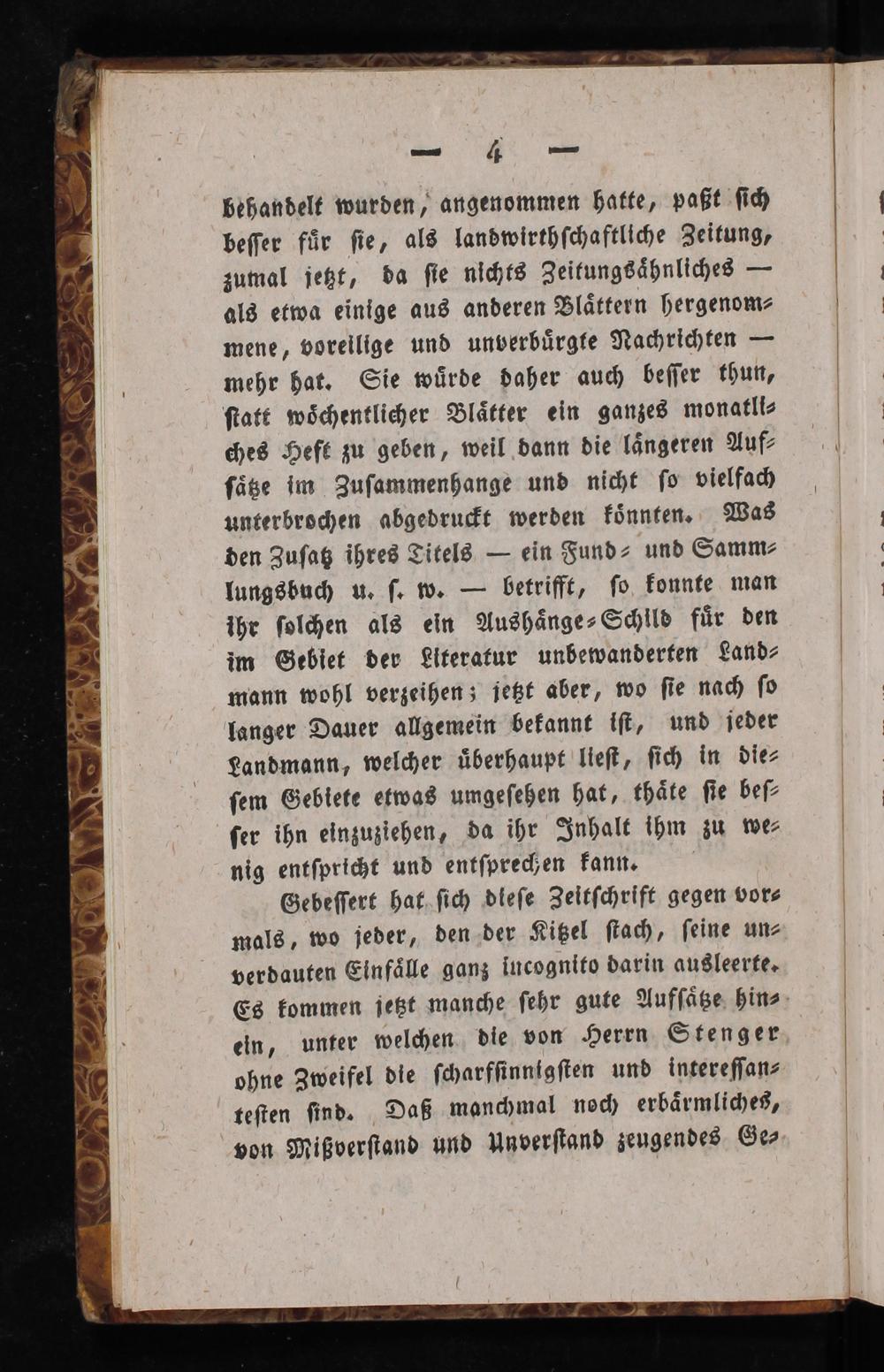 Gebeſſert hat ſich dieſe Zeitſchrift gegen vor⸗ mals, wo jeder, den der Kitzel ſtach, ſeine un⸗ verdauten Einfaͤlle ganz iucognito darin ausleerte. Es kommen jetzt manche ſehr gute Aufſaͤtze hin⸗ ein, unter welchen die von Herrn Stenger ohne Zweifel die ſcharfſinnigſten und intereſſan⸗ teſten ſind. Daß manchmal noch erbaͤrmliches, von Mißverſtand und Unverſtand zeugendes Ge⸗