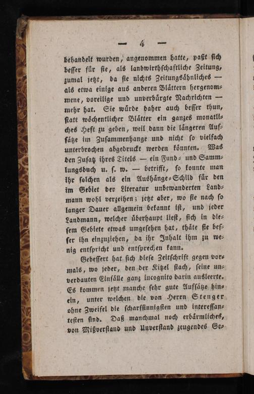 behandelt wurden, angenommen hatte, paßt ſich beſſer fuͤr ſie, als landwirthſchaftliche Zeitung, zumal jetzt, da ſie nichts Zeitungsaͤhnliches— als etwa einige aus anderen Blaͤttern hergenom⸗ mene, voreilige und unverbuͤrgte Nachrichten— mehr hat. Sie wuͤrde daher auch beſſer thun, ſtatt woͤchentlicher Blaͤtter ein ganzes monatli⸗ ches Heft zu geben, weil dann die laͤngeren Auf⸗ ſäͤtze im Zuſammenhange und nicht ſo vielfach unterbrochen abgedruckt werden koͤnnten. Was den Zuſatz ihres Titels— ein Fund⸗ und Samm⸗ lungsbuch u. ſ. w.— betrifft, ſo konnte man ihr ſolchen als ein Aushaͤnge⸗Schild fuͤr den im Gebiet der Literatur unbewanderten Land⸗ mann wohl verzeihen; jetzt aber, wo ſie nach ſo langer Dauer allgemein bekannt iſt, und jeder Landmann, welcher uͤberhaupt lieſt, ſich in die⸗ ſem Gebiete etwas umgeſehen hat, thaͤte ſie beſ⸗ ſer ihn einzuziehen, da ihr Inhalt ihm zu we⸗ nig entſpricht und entſprechen kann.