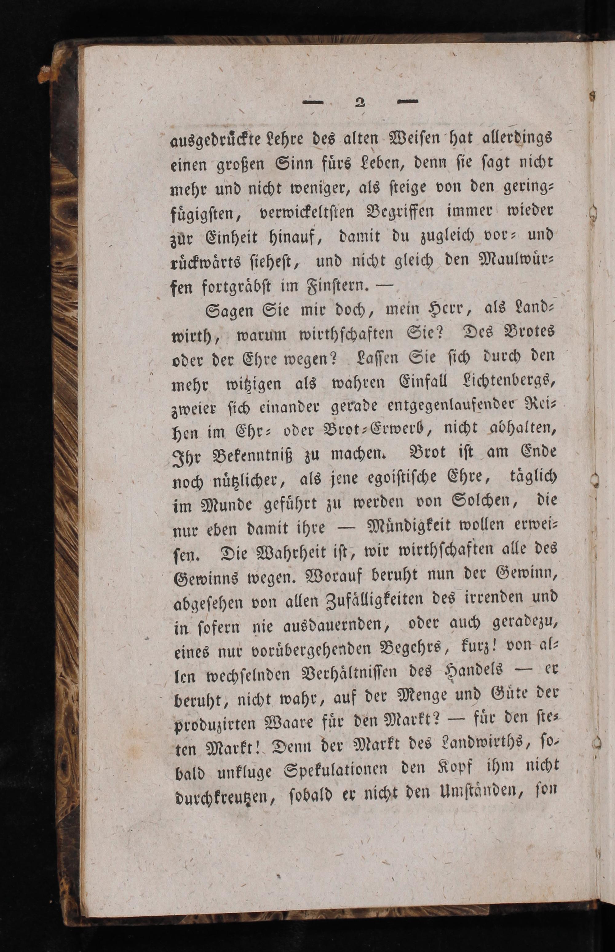 Sagen Sie mir doch, mein Herr, als Land⸗ wirth, warum wirthſchaften Sie? Des Brotes oder der Ehre wegen? Laſſen Sie ſich durch den mehr witzigen als wahren Einfall Lichtenbergs, zweier ſich einander gerade entgegenlaufender Rei⸗ hen im Ehr⸗ oder Brot⸗Erwerb, nicht abhalten, Ihr Bekenntniß zu machen. Brot iſt am Ende noch nuͤtzlicher, als jene egoiſtiſche Ehre, taͤglich im Munde gefuͤhrt zu werden von Solchen, die nur eben damit ihre— Muͤndigkeit wollen erwei⸗ ſen. Die Wahrheit iſt, wir wirthſchaften alle des Gewinns wegen. Worauf beruht nun der Gewinn, abgeſehen von allen Zufaͤlligkeiten des irrenden und in ſofern nie ausdauernden, oder auch geradezu, eines nur voruͤbergehenden Begehrs, kurz! von al⸗ len wechſelnden Verhaͤltniſſen des Handels— er beruht, nicht wahr, auf der Menge und Guͤte der produzirten Waare fuͤr den Markt?— fuͤr den ſte— ten Markt! Denn der Markt des Landwirths, ſo⸗ bald unkluge Spekulationen den Kopf ihm nicht durchkreutzen, ſobald er nicht den Umſtaͤnden, ſon