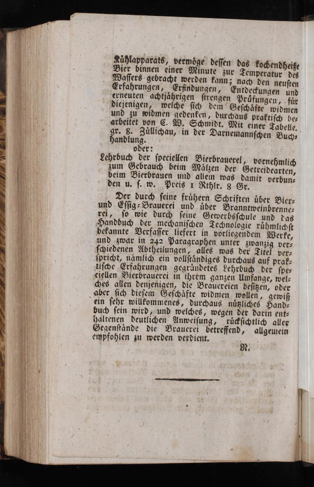 Der durch ſeine fruͤhern Schriften uͤber Bier⸗ und Eſſig⸗Brauerei und uͤber Branntweinbrenne⸗ rei, ſo wie durch ſeine Gewerbsſchule und das Handbuch der mechaniſchen Technologie ruͤhmlichſt bekannte Verfaſſer liefert in vorliegendem Werke, und zwar in 242 Paragraphen unter zwanzig ver⸗ ſchiedenen Abtheilungen, alles was der Titel ver⸗ ſpricht, naͤmlich ein vollſtaͤndiges durchaus auf prak⸗ tiſche Erfahrungen gegruͤndetes Lehrbuch der ſpe⸗ ciellen Bierbrauerei in ihrem ganzen Umfange, wel⸗ ches allen denjenigen, die Brauereien beſitzen, oder aber ſich dieſem Geſchaͤfte widmen wollen, gewiß ein ſehr willkommenes, durchaus nuͤtzliches Hand⸗ buch ſein wird, und welches, wegen der darin ent⸗ haltenen deutlichen Anweiſung, ruͤckſichtlich aller Gegenſtaͤnde die Brauerei betreffend, allgemein empfohlen zu werden verdient. R