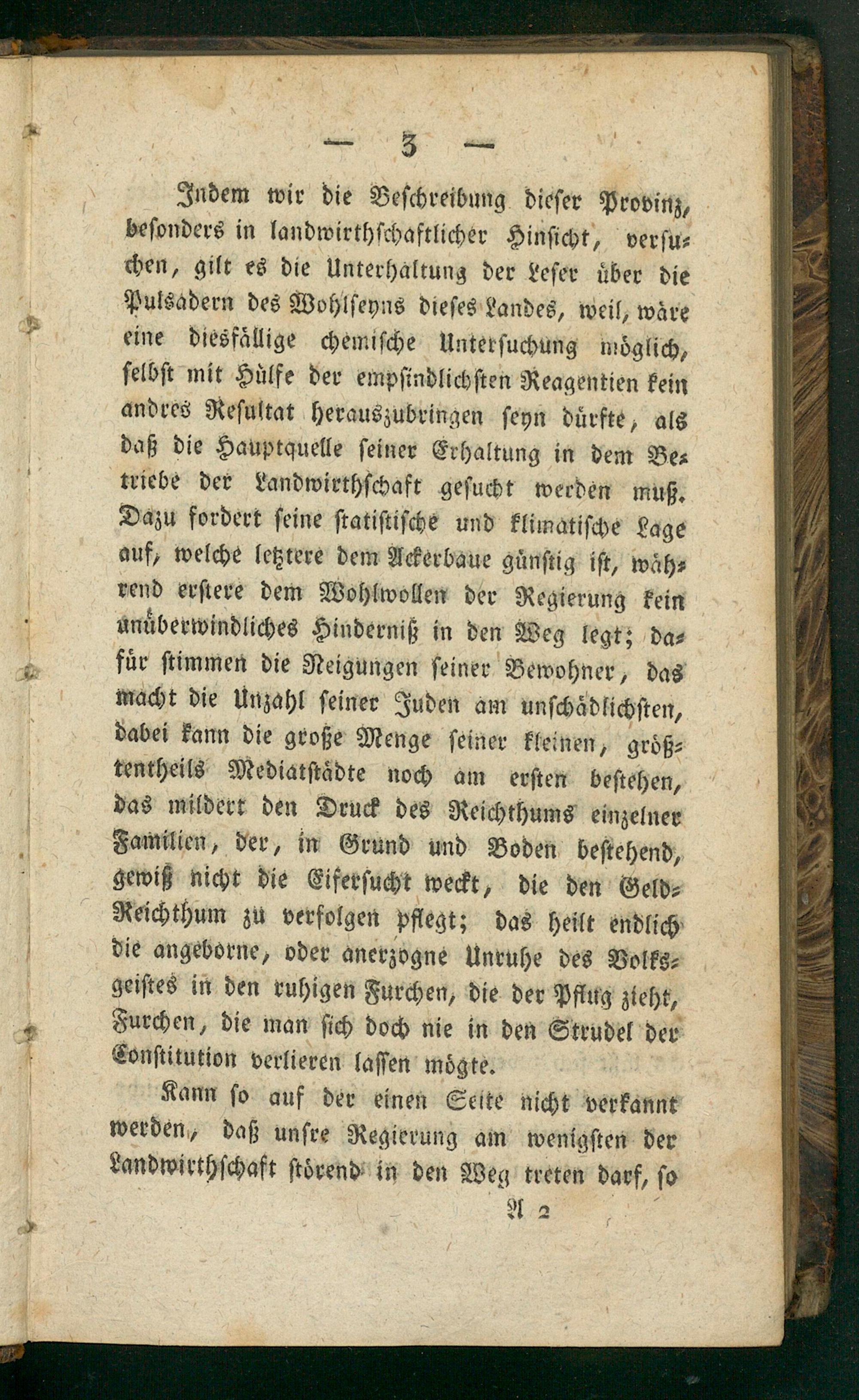 Indem wir die Beſchreibung dieſer Provinz, beſonders in landwirthſchaftlicher Hinſicht, verſu⸗ chen, gilt es die Unterhaltung der Leſer uͤber die Pulsadern des Wohlſeyns dieſes Landes, weil, waͤre eine diesfaͤllige chemiſche Unterſuchung moͤglich, ſelbſt mit Huͤlfe der empſindlichſten Reagentien kein andres Reſultat herauszubringen ſeyn duͤrfte, als daß die Hauptquelle ſeiner Erhaltung in dem Be⸗ triebe der Landwirthſchaft geſucht werden muß. Dazu fordert ſeine ſtatiſtiſche und klimatiſche Lage auf, welche letztere dem Ackerbaue guͤnſtig iſt, waͤh⸗ rend erſtere dem Wohlwollen der Regierung kein unuͤberwindliches Hinderniß in den Weg legt; da⸗ fuͤr ſtimmen die Neigungen ſeiner Bewohner, das macht die Unzahl ſeiner Juden am unſchaͤdlichſten, dabei kann die große Menge ſeiner kleinen, groͤß⸗ tentheils Mediatſtaͤdte noch am erſten beſtehen, das mildert den Druck des Reichthums einzelner Familien, der, in Grund und Boden beſtehend, gewiß nicht die Eiferſucht weckt, die den Geld⸗ Reichthum zu verfolgen pflegt; das heilt endlich die angeborne, oder anerzogne Unruhe des Volks⸗ geiſtes in den ruhigen Furchen, die der Pflug zieht, Furchen, die man ſich doch nie in den Strudel der Conſtitution verlieren laſſen moͤgte.