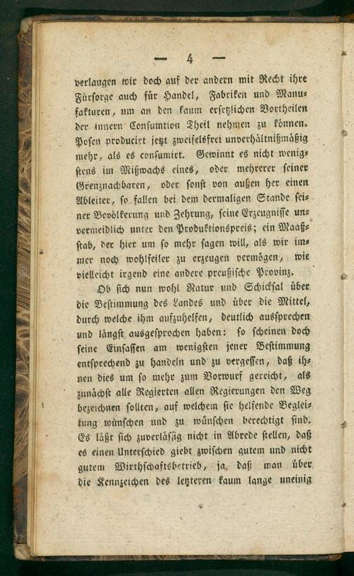 verlangen wir doch auf der andern mit Recht ihre Fuͤrſorge auch fuͤr Handel, Fabriken und Manu⸗ fakturen, um an den kaum erſetzlichen Vortheilen der innern Conſumtion Theil nehmen zu koͤnnen. Poſen produeirt jetzt zweifelsfrei unverhaͤltnißmaͤßig mehr, als es conſumirt. Gewinnt es nicht wenig⸗ ſtens im Mißwachs eines, oder mehrerer ſeiner Grenznachbaren, oder ſonſt von außen her einen