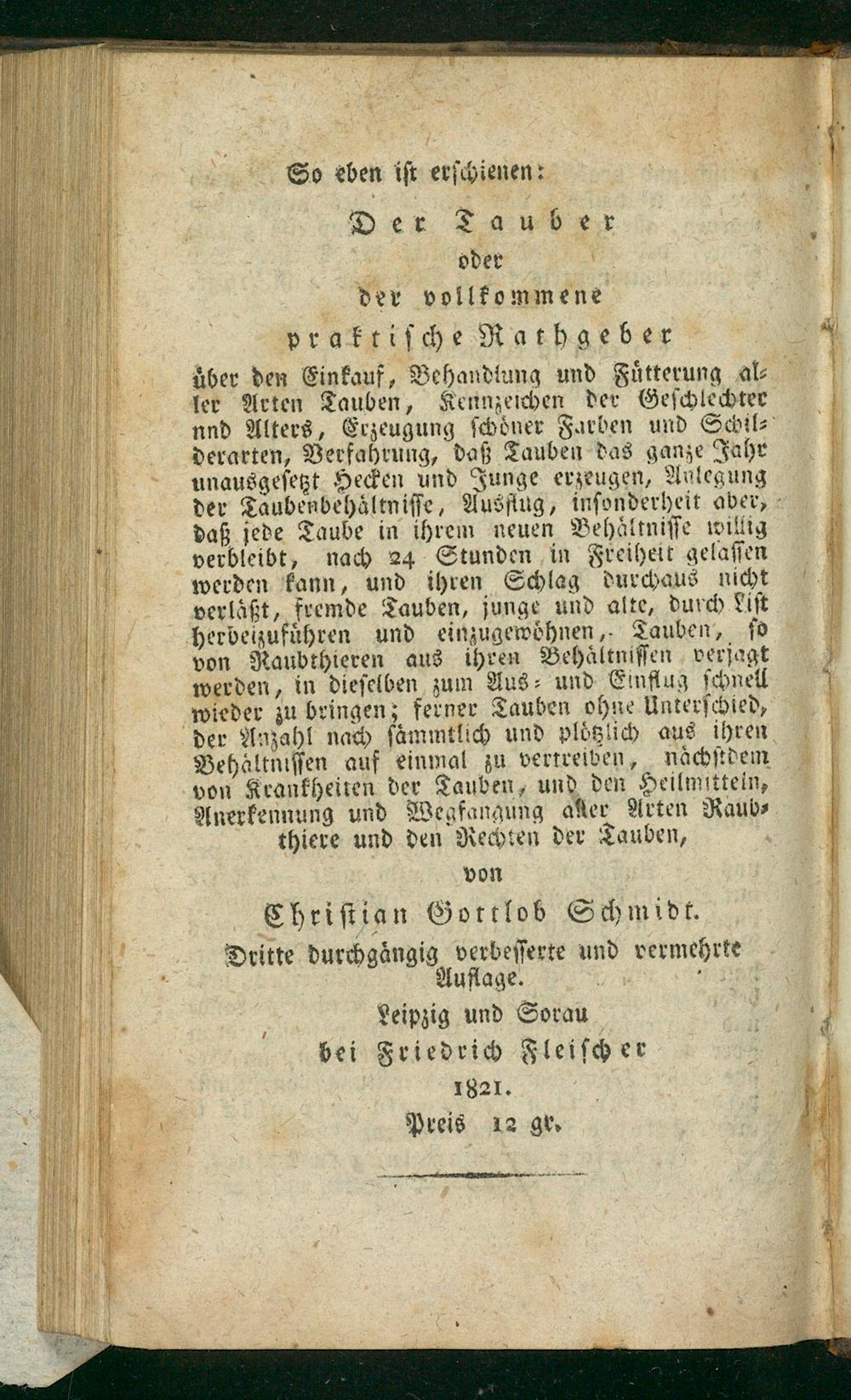 So eben iſt erſchienen: Der Tauber oder der vollkommene praktiſche Rathgeber aͤber den Einkauf, Behandlung und Fuͤtterung al⸗ ler Arten Tauben, Kennzeichen der Geſchlechter und Alters, Erzeugung ſchoͤner Farben und Schil⸗ derarten, Verfahrung, daß Tauben das ganze Jahr unausgeſetzt Hecken und Junge erzeugen, Antegung der Taubenbehaͤltniſſe, Ausflug, inſonderheit aber, daß jede Taube in ihrem neuen Behaͤltniſſe willig verbleibt, nach 24 Stunden in Freiheit gelaſſen werden kann, und ihren Schlag durchaus nicht verlaͤßt, fremde Tauben, junge und alte, durch Liſt herbeizufuͤhren und einzugewoͤhnen, Tauben, ſo von Raubthieren aus ihren Behaͤltniſſen verjagt werden, in dieſelben zum Aus⸗ und Einflug ſchnell wieder zu bringen; ferner Tauben ohne ÜUnterſchied, der Anzahl nach ſaͤmmtlich und ploͤßlich aus ihren Behaͤltniſſen auf einmal zu vertreiben, naͤchſtdem von Krankheiten der Tauben, und den Heilmittein, Anerkennung und Wegfangung aller Arten Raub⸗ thiere und den Rechten der Tauben,