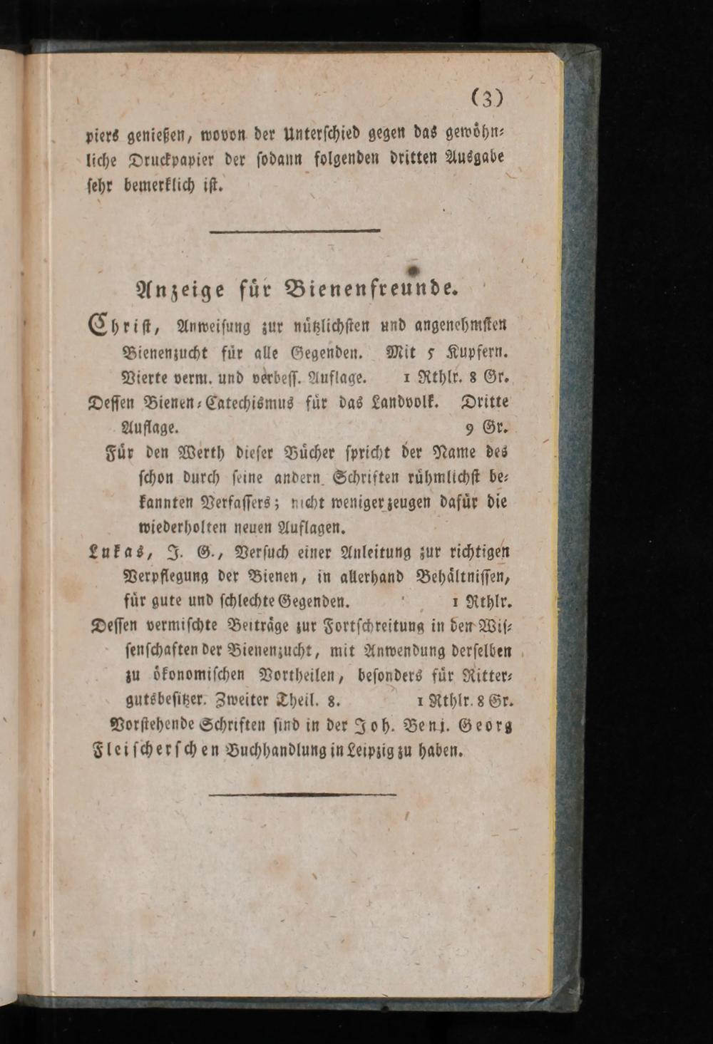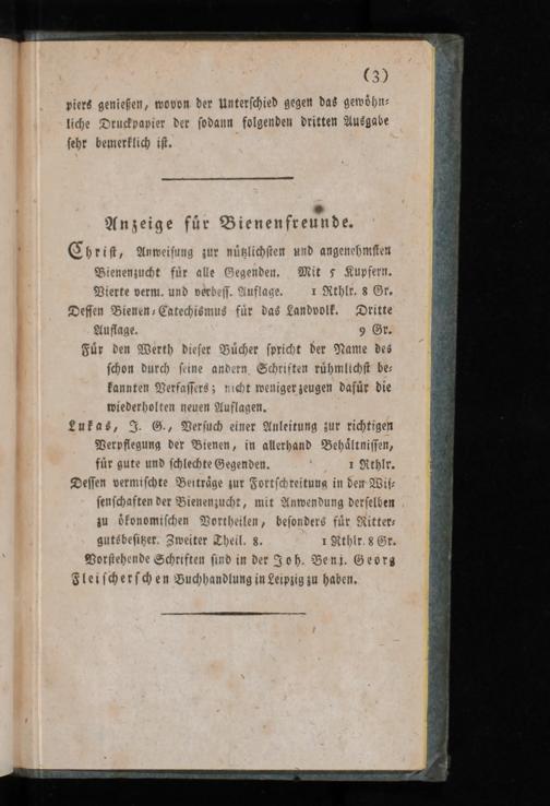 Vierte verm. und verbeſſ. Auflage. 1 Rthlr. 8 Gr. Deſſen Bienen⸗Catechismus fuͤr das Landvolk. Dritte Auflage. 9 Gr.