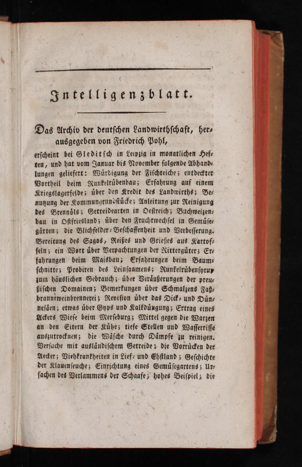 erſcheint bei Gleditſch in Leipzig in monatlichen Hef⸗ ten, und hat vom Januar bis November folgende Abhand⸗ lungen geliefert: Wuͤrdigung der Fiſchteiche; entdeckter Vortheil beim Nunkelruͤbenbau; Erfahrung auf einem Kriegslagerfelde; uͤber den Kredit des Landwirths; Be⸗ nutzung der Kommungrundſtuͤcke; Anleitung zur Reinigung des Brennoͤls; Getreidearten in Oeſtreich; Buchweizen⸗ bau in Oſtfriesland; uͤber den Fruchtwechſel in Gemuͤſe⸗ gaͤrten; die Blichfelder⸗Beſchaffenheit und Verbeſſerung. Bereitung des Sagos, Reißes und Grießes aus Kartof⸗ feln; ein Wort uͤber Verpachtungen der Ritterguͤter; Er⸗ fahrungen beim Maisbau; Erfahrungen beim Baum⸗ ſchnitte; Probiren des Leinſaamens; Runkelruͤbenſyrup zum haͤuslichen Gebrauch; uͤber Veraͤußerungen der preu⸗ biſchen Domainen; Bemerkungen uͤber Schmalzens Faß⸗ branntweinbrennerei; Reviſion uͤber das Dick⸗ und Duͤn⸗ neſaͤen; etwas uͤber Gyps und Kalkduͤngung; Ertrag eines Ackers Wieſe beim Merſeburg; Mittel gegen die Warzen an den Eitern der Kuͤhe; tiefe Stellen und Waſeerriſſe auszutrocknen; die Waͤſche durch Daͤmpfe zu reinigen. Verſuche mit auslaͤndiſchem Getreide; die Vorruͤcken der Aecker; Viehkrankheiten in Lief⸗ und Ehſtland; Geſchichte der Klauenſeuche; Einrichtung eines Gemuͤſegartens; Ur⸗ ſachen des Verlammens der Schaafe; hohes Beiſpiel; die
