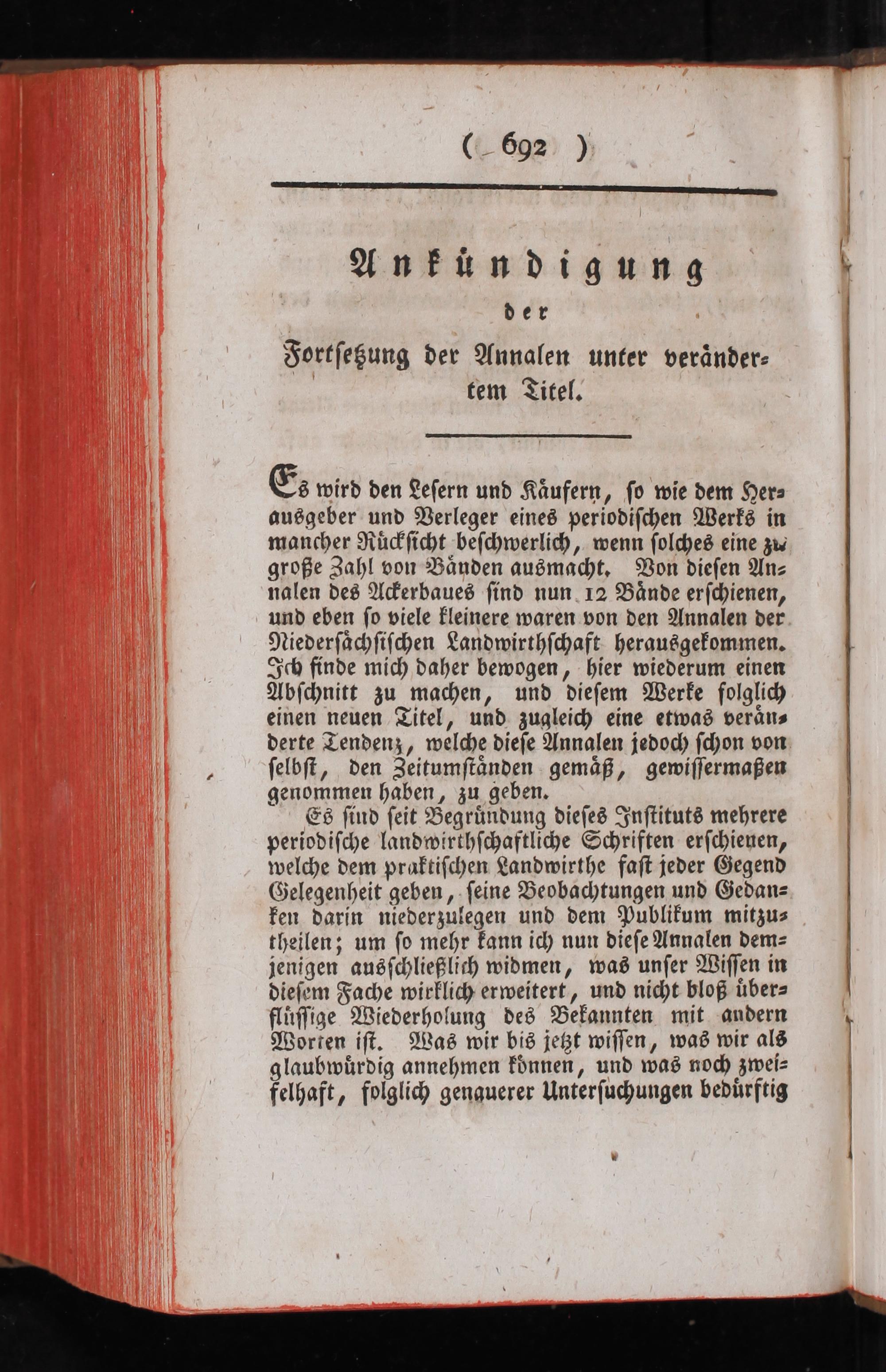 Es wird den Leſern und Kaͤufern, ſo wie dem Her⸗ ausgeber und Verleger eines periodiſchen Werks in mancher Ruͤckſicht beſchwerlich, wenn ſolches eine zu⸗ große Zahl von Baͤnden ausmacht. Von dieſen An⸗ nalen des Ackerbaues ſind nun 12 Bande erſchienen, und eben ſo viele kleinere waren von den Annalen der Niederſaͤchſiſchen Landwirthſchaft herausgekommen. Ich finde mich daher bewogen, hier wiederum einen Abſchnitt zu machen, und dieſem Werke folglich einen neuen Titel, und zugleich eine etwas veraͤn⸗ derte Tendenz, welche dieſe Annalen jedoch ſchon von ſelbſt, den Zeitumſtaͤnden gemaͤß, gewiſſermaßen genommen haben, zu geben.