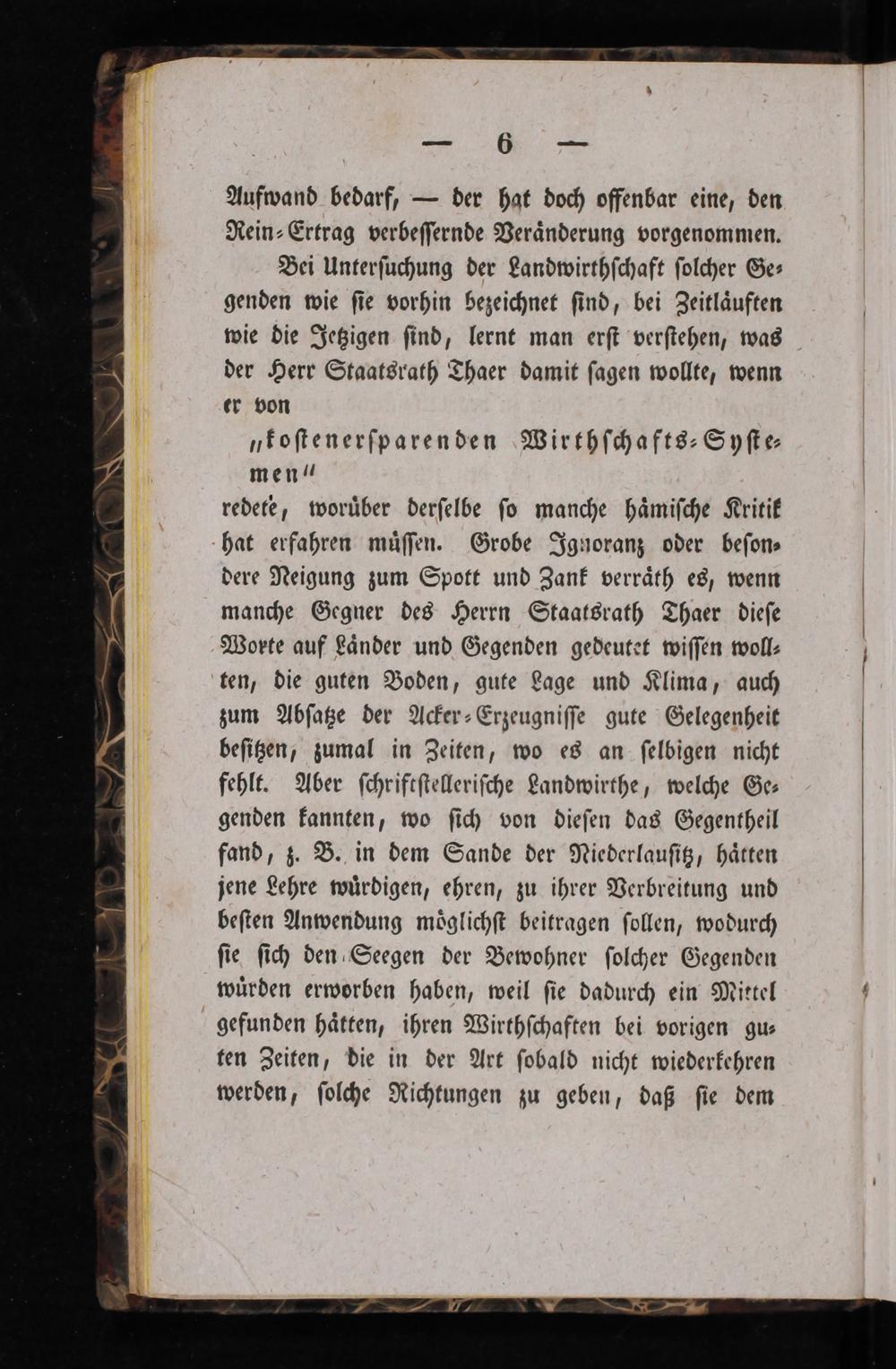 Aufwand bedarf,— der hat doch offenbar eine, den Rein⸗Ertrag verbeſſernde Veraͤnderung vorgenommen. Bei Unterſuchung der Landwirthſchaft ſolcher Ge⸗ genden wie ſie vorhin bezeichnet ſind, bei Zeitlaͤuften wie die Jetzigen ſind, lernt man erſt verſtehen, was der Herr Staatsrath Thaer damit ſagen wollte, wenn er von nkoſtenerſparenden Wirthſchafts⸗Syſte⸗ men“ redete, woruͤber derſelbe ſo manche haͤmiſche Kritik hat erfahren muͤſſen. Grobe Ignoranz oder beſon⸗ dere Neigung zum Spott und Zank verraͤth es, wenn manche Gegner des Herrn Staatsrath Thaer dieſe Worte auf Laͤnder und Gegenden gedeutet wiſſen woll⸗ ten, die guten Boden, gute Lage und Klima, auch zum Abſatze der Acker⸗Erzeugniſſe gute Gelegenheit beſitzen, zumal in Zeiten, wo es an ſelbigen nicht fehlt. Aber ſchriftſtelleriſche Landwirthe, welche Ge⸗ genden kannten, wo ſich von dieſen das Gegentheil fand, z. B. in dem Sande der Niederlauſitz, haͤtten jene Lehre wuͤrdigen, ehren, zu ihrer Verbreitung und beſten Anwendung moͤglichſt beitragen ſollen, wodurch ſie ſich den Seegen der Bewohner ſolcher Gegenden wuͤrden erworben haben, weil ſie dadurch ein Mittel gefunden haͤtten, ihren Wirthſchaften bei vorigen gu⸗ ten Zeiten, die in der Art ſobald nicht wiederkehren werden, ſolche Richtungen zu geben, daß ſie dem