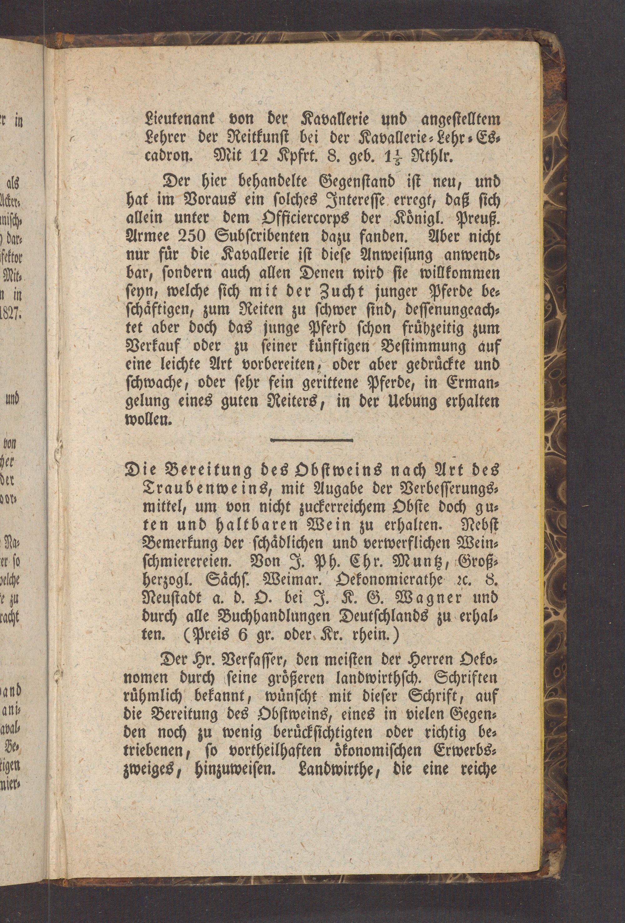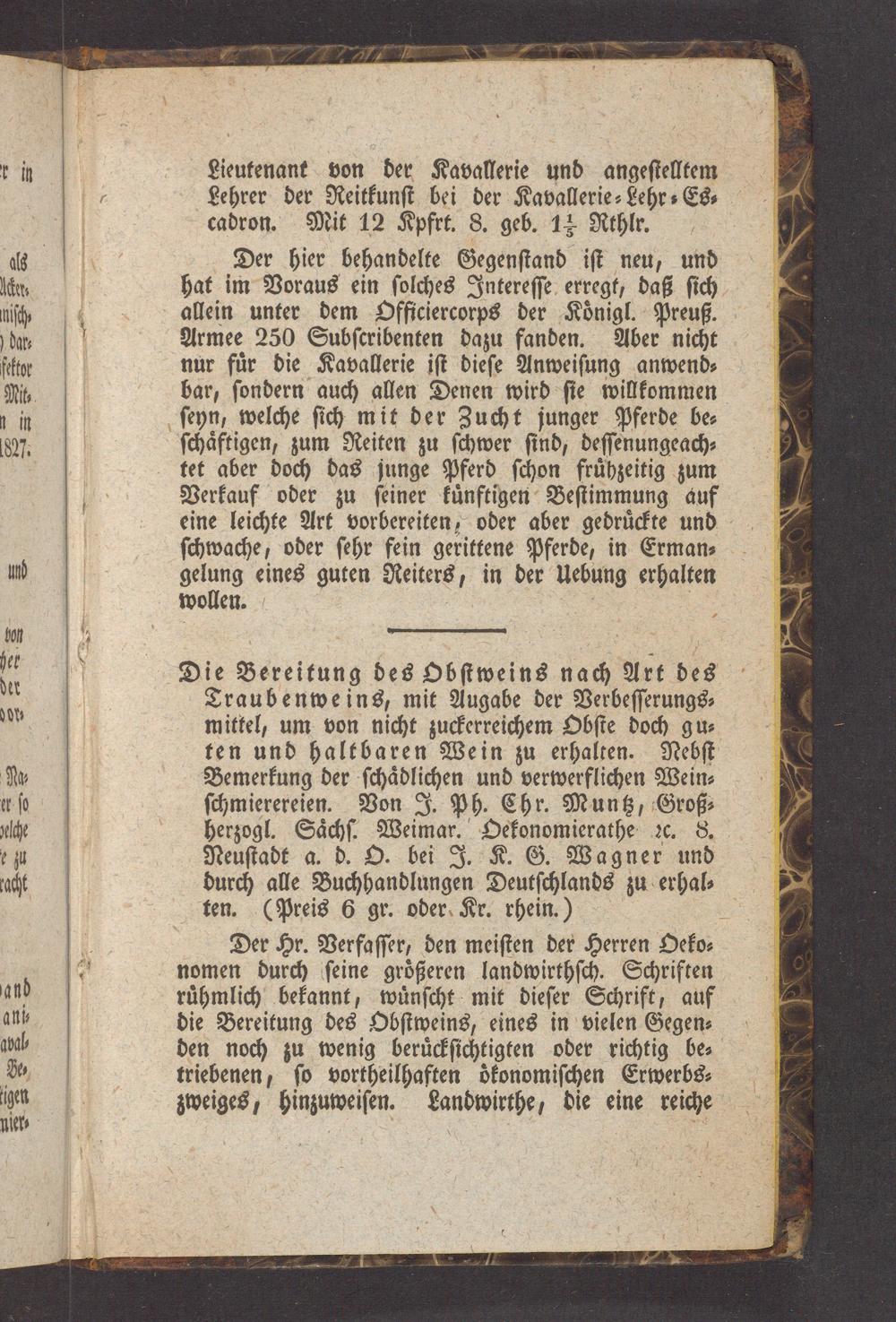 Traubenweins, mit Augabe der Verbeſſerungs⸗ mittel, um von nicht zuckerreichem Obſte doch gu⸗ ten und haltbaren Wein zu erhalten. Nebſt Bemerkung der ſchaͤdlichen und verwerflichen Wein⸗ ſchmierereien. Von J. Ph. Chr. Muntz, Groß⸗ herzogl. Saͤchſ. Weimar. Oekonomierathe ꝛc. 8. Neuſtadt a. d. O. bei J. K. G. Wagner und durch alle Buchhandlungen Deutſchlands zu erhal⸗ ten.(Preis 6 gr. oder Kr. rhein.)