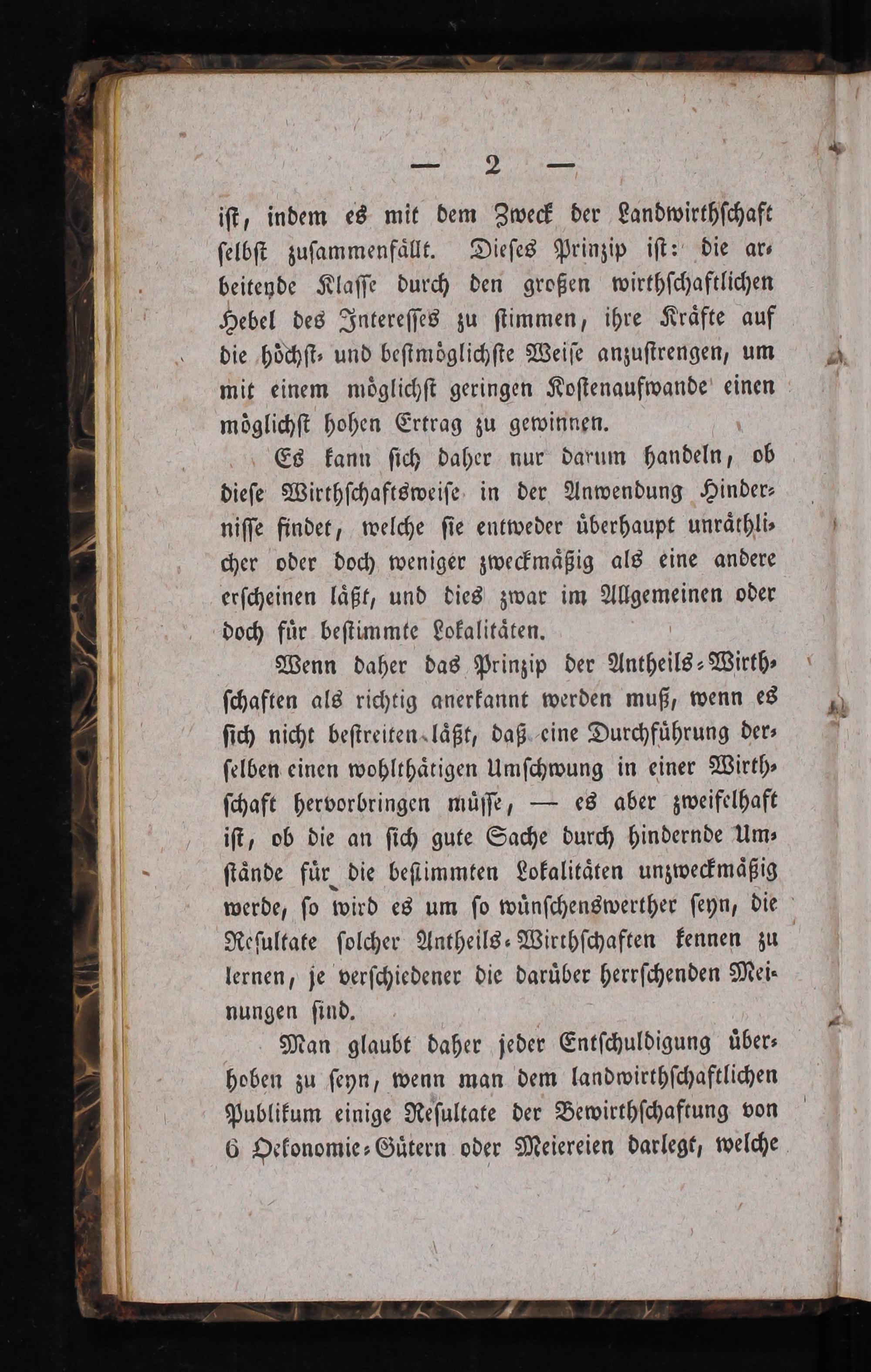 Wenn daher das Prinzip der Antheils⸗Wirth⸗ ſchaften als richtig anerkannt werden muß, wenn es ſich nicht beſtreiten laͤßt, daß eine Durchfuͤhrung der⸗ ſelben einen wohlthaͤtigen Umſchwung in einer Wirth⸗ ſchaft hervorbringen muͤſſe,— es aber zweifelhaft iſt, ob die an ſich gute Sache durch hindernde Um⸗ ſtaͤnde fuͤr die beſtimmten Lokalitaͤten unzweckmaͤßig werde, ſo wird es um ſo wuͤnſchenswerther ſeyn, die Reſultate ſolcher Antheils⸗Wirthſchaften kennen zu lernen, je verſchiedener die daruͤber herrſchenden Mei⸗ nungen ſind.