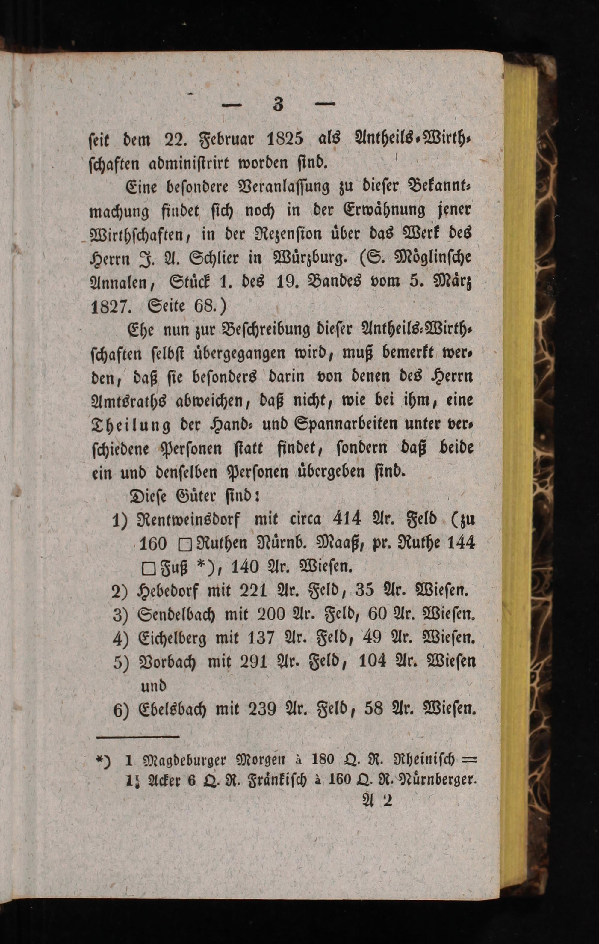 Eine beſondere Veranlaſſung zu dieſer Bekannt⸗ machung findet ſich noch in der Erwaͤhnung jener Wirthſchaften, in der Rezenſion uͤber das Werk des Herrn J. A. Schlier in Wuͤrzburg.(S. Moͤglinſche Annalen, Stuͤck 1. des 19. Bandes vom 5. Maͤrz 1827. Seite 68.)