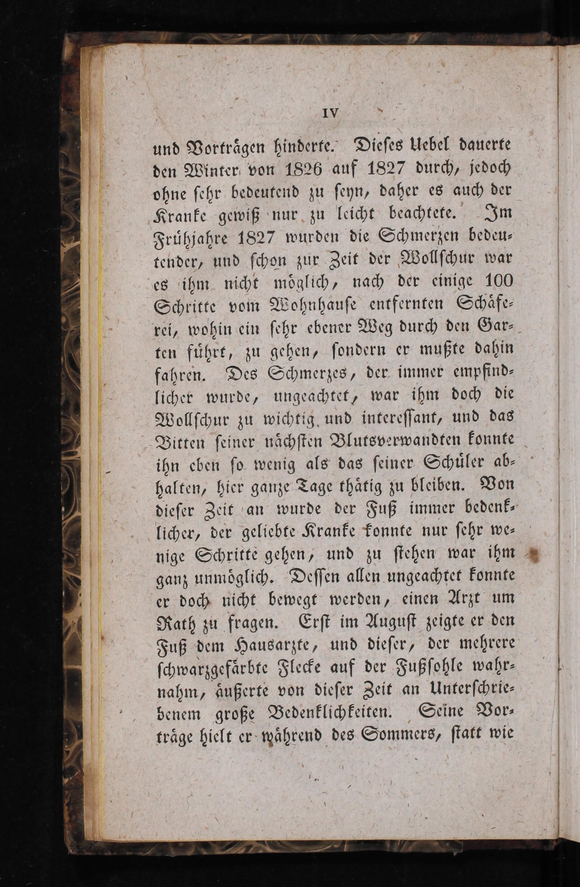 und Vortraͤgen hinderte. Dieſes Uebel dauerte den Winter von 1826 auf 1827 durch, jedoch ohne ſehr bedeutend zu ſeyn, daher es auch der Kranke gewiß nur zu leicht beachtete. Im Fruͤhjahre 1827 wurden die Schmerzen bedeu⸗ tender, und ſchon zur Zeit der Wollſchur war es ihm nicht moͤglich, nach der einige 100 Schritte vom Wohnhauſe entfernten Schaͤfe⸗ rei, wohin ein ſehr ebener Weg durch den Gar⸗ ten fuͤhrt, zu gehen, ſondern er mußte dahin fahren. Des Schmerzes, der immer empfind— licher wurde, ungeachtet, war ihm doch die Wollſchur zu wichtig und intereſſant, und das Bitten ſeiner naͤchſten Blutsverwandten konnte ihn eben ſo wenig als das ſeiner Schuͤler ab⸗ halten, hier ganze Tage thaͤtig zu bleiben. Von dieſer Zeit an wurde der Fuß immer bedenk⸗ licher, der geliebte Kranke konnte nur ſehr we— nige Schritte gehen, und zu ſtehen war ihm ganz unmoͤglich. Deſſen allen ungeachtet konnte er doch nicht bewegt werden, einen Arzt um Rath zu fragen. Erſt im Auguſt zeigte er den Fuß dem Hausarzte, und dieſer, der mehrere ſchwarzgefaͤrbte Flecke auf der Fußſohle wahr⸗ nahm, außerte von dieſer Zeit an Unterſchrie⸗ benem große Bedenklichkeiten. Seine Vor⸗ traͤge hielt er waͤhrend des Sommers, ſtatt wie