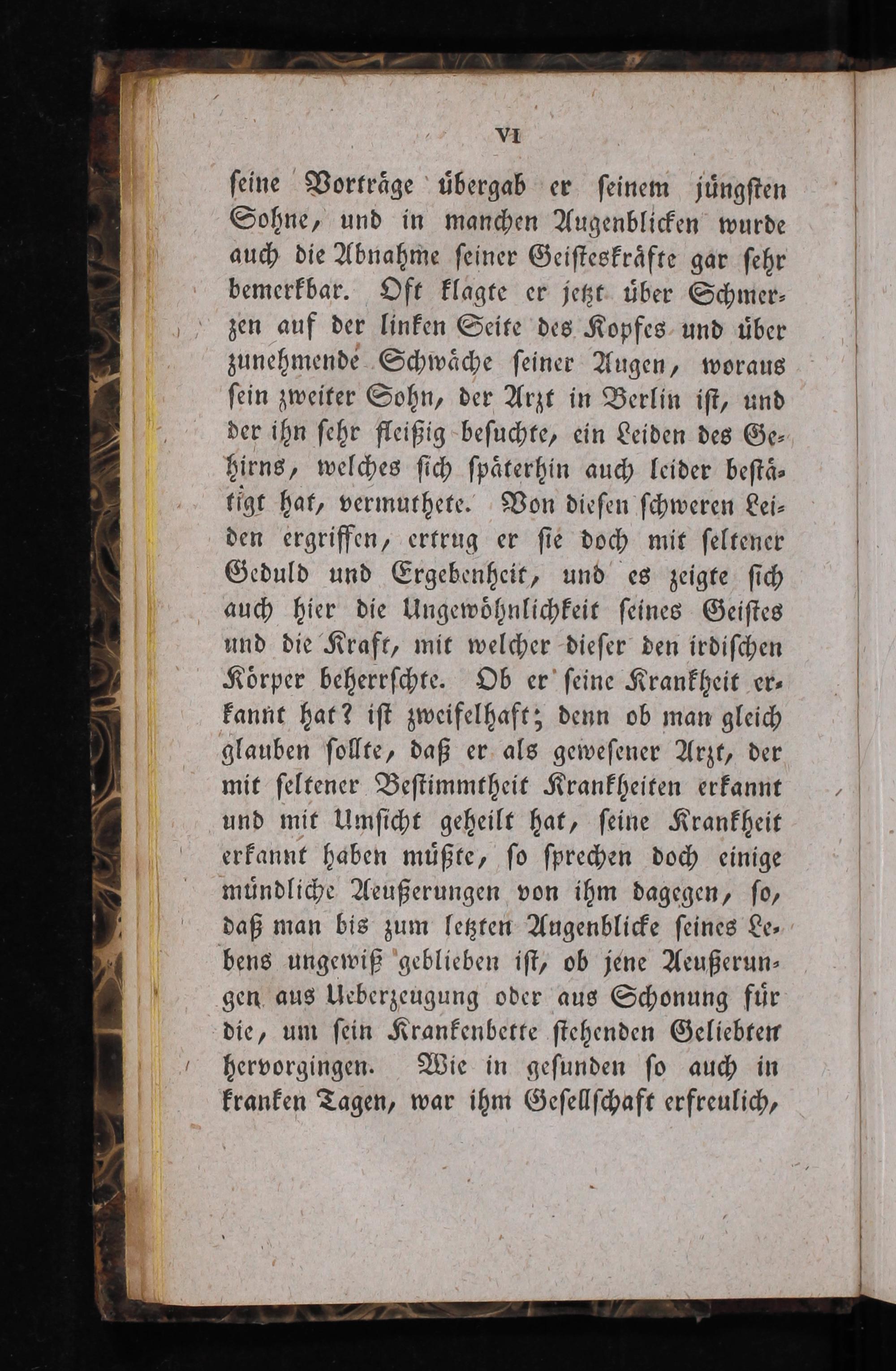 Sohne, und in manchen Augenblicken wurde auch die Abnahme ſeiner Geiſteskraͤfte gar ſehr bemerkbar. Oft klagte er jetzt uͤber Schmer⸗ zen auf der linken Seite des Kopfes und uͤber zunehmende Schwaͤche ſeiner Augen, woraus ſein zweiter Sohn, der Arzt in Berlin iſt, und der ihn ſehr fleißig beſuchte, ein Leiden des Ge⸗ hirns, welches ſich ſpaͤterhin auch leider beſtaͤ⸗ tigt hat, vermuthete. Von dieſen ſchweren Lei⸗ den ergriffen, ertrug er ſie doch mit ſeltener Geduld und Ergebenheit, und es zeigte ſich auch hier die Ungewoͤhnlichkeit ſeines Geiſtes und die Kraft, mit welcher dieſer den irdiſchen Koͤrper beherrſchte. Ob er ſeine Krankheit er⸗ kannt hat? iſt zweifelhaft; denn ob man gleich glauben ſollte, daß er als geweſener Arzt, der mit ſeltener Beſtimmtheit Krankheiten erkannt und mit Umſicht geheilt hat, ſeine Krankheit erkannt haben muͤßte, ſo ſprechen doch einige muͤndliche Aeußerungen von ihm dagegen, ſo, daß man bis zum letzten Augenblicke ſeines Le⸗ bens ungewiß geblieben iſt, ob jene Aeußerun⸗ gen aus Ueberzeugung oder aus Schonung fuͤr die, um ſein Krankenbette ſtehenden Geliebten