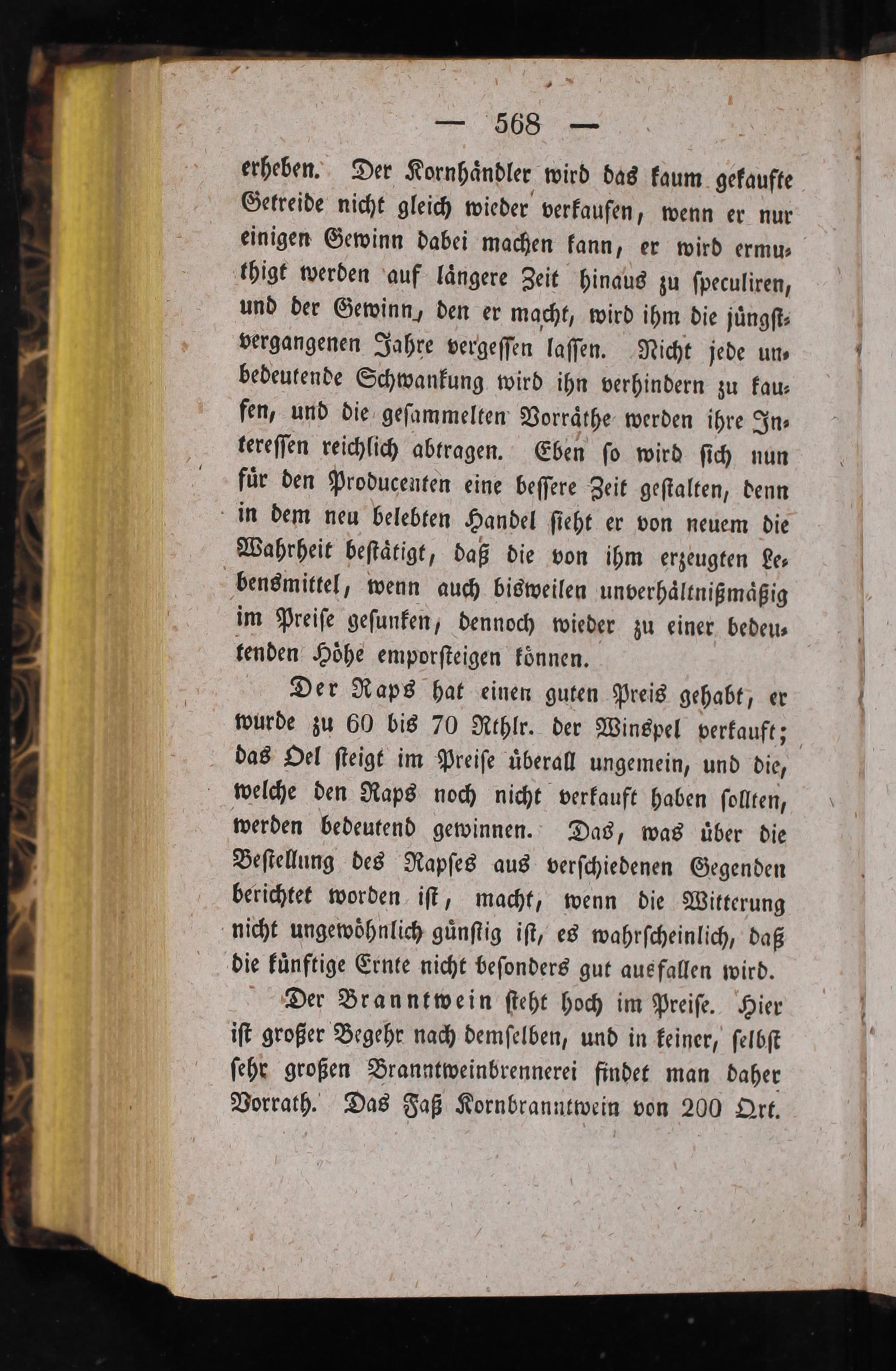 Der Branntwein ſteht hoch im Preiſe. Hier iſt großer Begehr nach demſelben, und in keiner, ſelbſt ſehr großen Branntweinbrennerei findet man daher Vorrath. Das Faß Kornbranntwein von 200 QOrt.