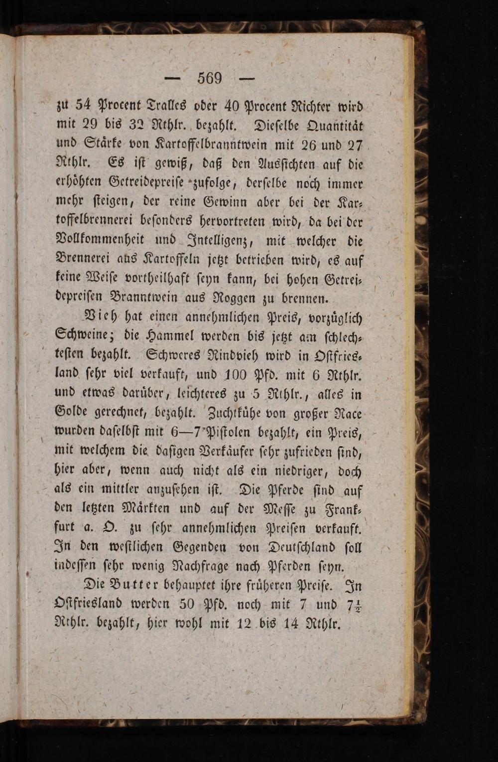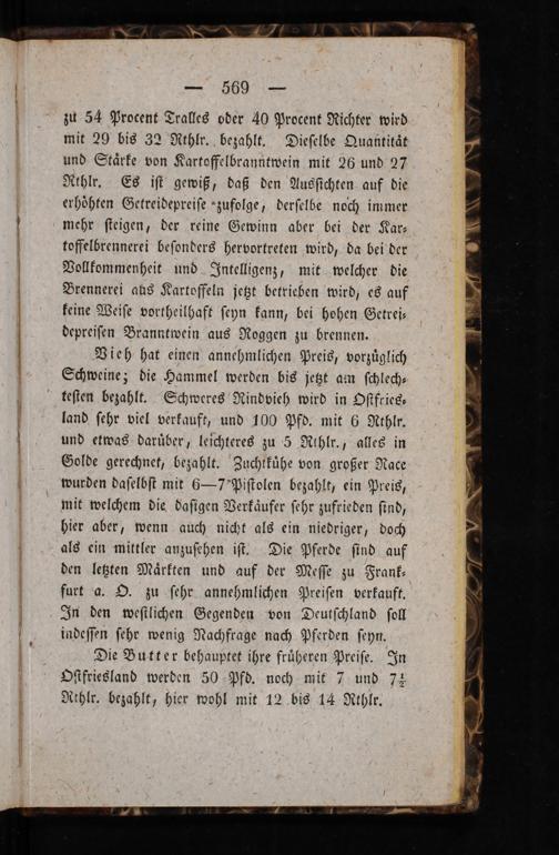 zu 54 Procent Tralles oder 40 Procent Richter wird mit 29 bis 32 Rthlr. bezahlt. Dieſelbe Quantitaͤt und Staͤrke von Kartoffelbranntwein mit 26 und 27 Rthlr. Es iſt gewiß, daß den Ausſichten auf die erhoͤhten Getreidepreiſe zufolge, derſelbe noch immer mehr ſteigen, der reine Gewinn aber bei der Kar⸗ toffelbrennerei beſonders hervortreten wird, da bei der Vollkommenheit und Intelligenz, mit welcher die Brennerei aus Kartoffeln jetzt betrieben wird, es auf keine Weiſe vortheilhaft ſeyn kann, bei hohen Getrei— depreiſen Branntwein aus Roggen zu brennen. Vieh hat einen annehmlichen Preis, vorzuͤglich Schweine; die Hammel werden bis jetzt am ſchlech⸗ teſten bezahlt. Schweres Rindvieh wird in Oſtfries⸗ land ſehr viel verkauft, und 100 Pfd. mit 6 Rthlr. und etwas daruͤber, leichteres zu 5 Rthlr., alles in Golde gerechnet, bezahlt. Zuchtkuͤhe von großer Race wurden daſelbſt mit 6—7 Piſtolen bezahlt, ein Preis, mit welchem die daſigen Verkaͤufer ſehr zufrieden ſind, hier aber, wenn auch nicht als ein niedriger, doch als ein mittler anzuſehen iſt. Die Pferde ſind auf den letzten Maͤrkten und auf der Meſſe zu Frank— furt a. O. zu ſehr annehmlichen Preiſen verkauft. In den weſtlichen Gegenden von Deutſchland ſoll indeſſen ſehr wenig Nachfrage nach Pferden ſeyn. Die Butter behauptet ihre fruͤheren Preiſe. In Oſtfriesland werden 50 Pfd. noch mit 7 und 7½ Rthlr. bezahlt, hier wohl mit 12 bis 14 Rthlr.