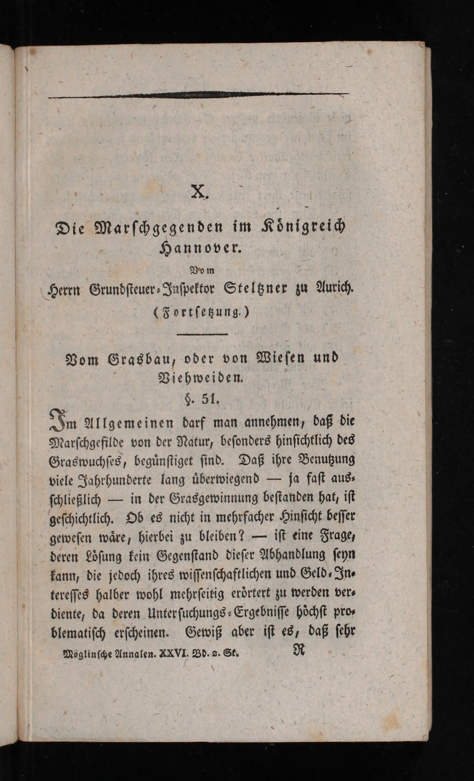 Im Allgemeinen darf man annehmen, baß die Marſchgefilde von der Natur, beſonders hinſichtlich des Graswuchſes, beguͤnſtiget ſind. Daß ihre Benutzung viele Jahrhunderte lang uͤberwiegend— ja faſt aus⸗ ſchließlich— in der Grasgewinnung beſtanden hat, iſt geſchichtlich. Ob es nicht in mehrfacher Hinſicht beſſer geweſen waͤre, hierbei zu bleiben?— iſt eine Frage, deren Loͤſung kein Gegenſtand dieſer Abhandlung ſeyn kann, die jedoch ihres wiſſenſchaftlichen und Geld⸗In⸗ tereſſes halber wohl mehrſeitig eroͤrtert zu werden ver⸗ diente, da deren Unterſuchungs⸗Ergebniſſe hoͤchſt pro⸗ blematiſch erſcheinen. Gewiß aber iſt es, daß ſehr Möglinſche Annalen. XXVI. Bd. 2. St. R