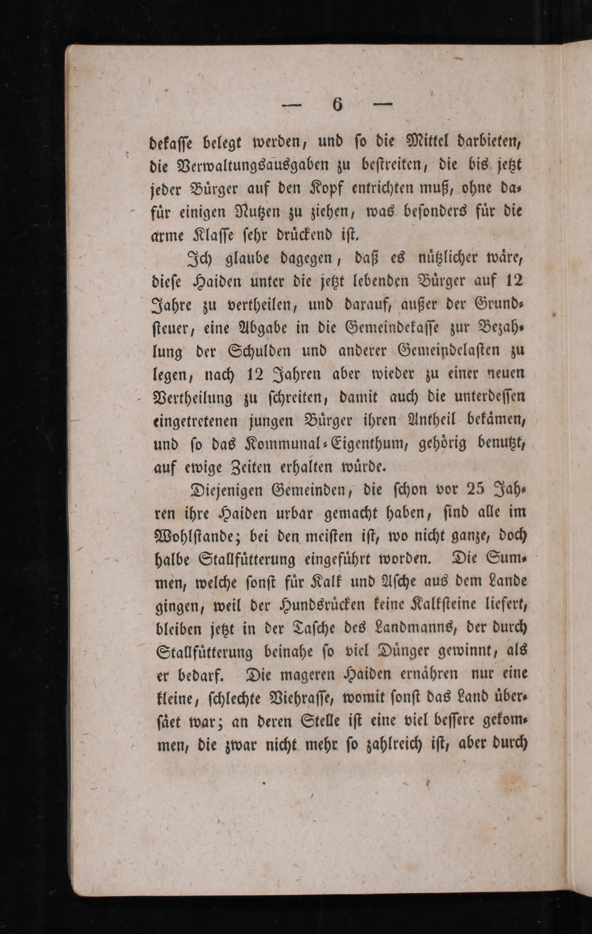 Ich glaube dagegen, daß es nuͤtzlicher waͤre, dieſe Haiden unter die jetzt lebenden Buͤrger auf 12 Jahre zu vertheilen, und darauf, außer der Grund⸗ ſteuer, eine Abgabe in die Gemeindekaſſe zur Bezah⸗ lung der Schulden und anderer Gemeindelaſten zu legen, nach 12 Jahren aber wieder zu einer neuen Vertheilung zu ſchreiten, damit auch die unterdeſſen eingetretenen jungen Buͤrger ihren Antheil bekaͤmen, und ſo das Kommunal-Eigenthum, gehoͤrig benutzt, auf ewige Zeiten erhalten wuͤrde.