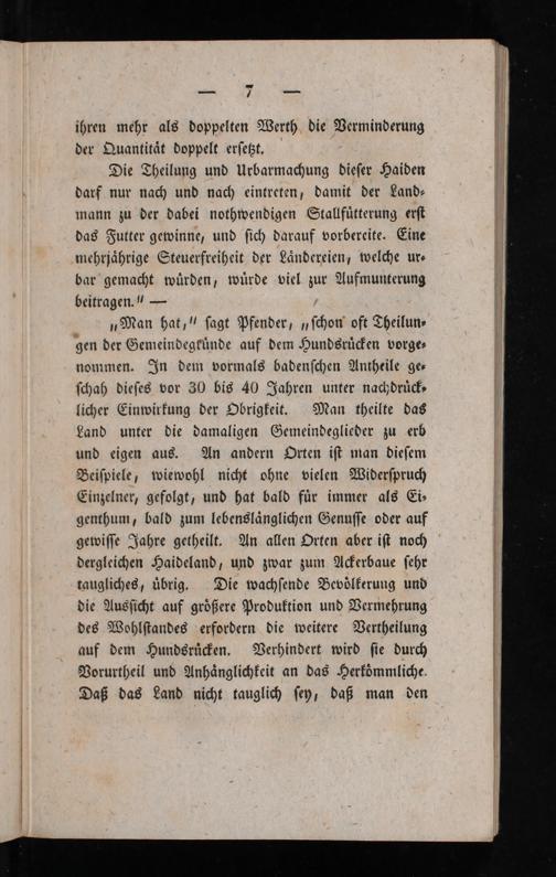 „Man hat,“ ſagt Pfender,„ſchon oft Theilun⸗ gen der Gemeindegkuͤnde auf dem Hundsruͤcken vorge⸗ nommen. In dem vormals badenſchen Antheile ge⸗ ſchah dieſes vor 30 bis 40 Jahren unter nachdruͤck⸗ licher Einwirkung der Obrigkeit. Man theilte das Land unter die damaligen Gemeindeglieder zu erb und eigen aus. An andern Orten iſt man dieſem Beiſpiele, wiewohl nicht ohne vielen Widerſpruch Einzelner, gefolgt, und hat bald fuͤr immer als Ei⸗ genthum, bald zum lebenslaͤnglichen Genuſſe oder auf gewiſſe Jahre getheilt. An allen Orten aber iſt noch dergleichen Haideland, und zwar zum Ackerbaue ſehr taugliches, uͤbrig. Die wachſende Bevoͤlkerung und die Ausſicht auf groͤßere Produktion und Vermehrung des Wohlſtandes erfordern die weitere Vertheilung auf dem Hundsruͤcken. Verhindert wird ſie durch Vorurtheil und Anhaͤnglichkeit an das Herkoͤmmliche. Daß das Land nicht tauglich ſey, daß man den