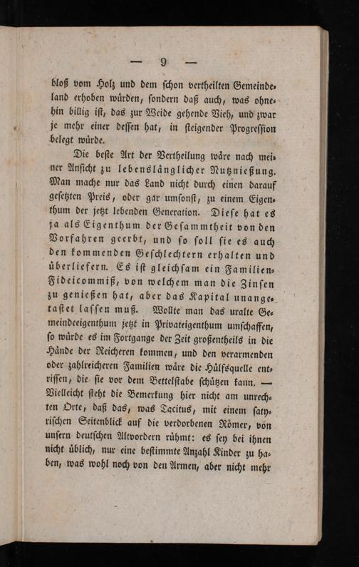 bloß vom Holz und dem ſchon vertheilten Gemeinde⸗ land erhoben wuͤrden, ſondern daß auch, was ohne⸗ hin billig iſt, das zur Weide gehende Vieh, und zwar je mehr einer deſſen hat, in ſteigender Progreſſion belegt wuͤrde.. Die beſte Art der Vertheilung waͤre nach mei⸗ ner Anſicht zu lebenslaͤnglicher Nutznießung. Man mache nur das Land nicht durch einen darauf geſetzten Preis, oder gar umſonſt, zu einem Eigen⸗ thum der jetzt lebenden Generation. Dieſe hat es ja als Eigenthum der Geſammtheit von den Vorfahren geerbt, und ſo ſoll ſie es auch den kommenden Geſchlechtern erhalten und uͤberliefern. Es iſt gleichſam ein Familien⸗ Fideicommiß, von welchem man die Zinſen zu genießen hat, aber das Kapital unange⸗ taſtet laſſen muß. Wollte man das uralte Ge⸗ meindeeigenthum jetzt in Privateigenthum umſchaffen, ſo wuͤrde es im Fortgange der Zeit großentheils in die Haͤnde der Reicheren kommen, und den verarmenden oder zahlreicheren Familien waͤre die Huͤlfsquelle ent⸗ riſſen, die ſie vor dem Bettelſtabe ſchuͤtzen kann.— Vielleicht ſteht die Bemerkung hier nicht am unrech⸗ ten Orte, daß das, was Tacitus, mit einem ſaty⸗ riſchen Seitenblick auf die verdorbenen Roͤmer, von unſern deutſchen Altvordern ruͤhmt: es ſey bei ihnen nicht uͤblich, nur eine beſtimmte Anzahl Kinder zu ha⸗ ben, was wohl noch von den Armen, aber nicht mehr