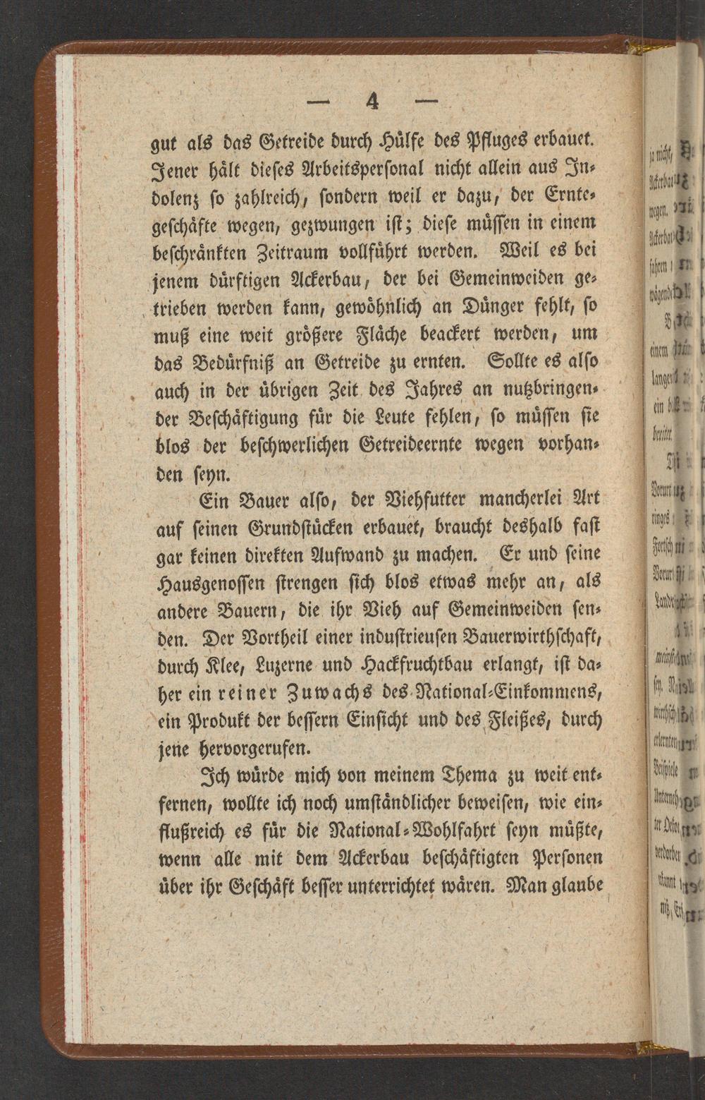 Ein Bauer alſo, der Viehfutter mancherlei Art auf ſeinen Grundſtuͤcken erbauet, braucht deshalb faſt gar keinen direkten Aufwand zu machen. Er und ſeine Hausgenoſſen ſtrengen ſich blos etwas mehr an, als andere Bauern, die ihr Vieh auf Gemeinweiden ſen⸗ den. Der Vortheil einer induſtrieuſen Bauerwirthſchaft, durch Klee, Luzerne und Hackfruchtbau erlangt, iſt da⸗ her ein reiner Zuwachs des National⸗Einkommens, ein Produkt der beſſern Einſicht und des Fleißes, durch jene hervorgerufen.