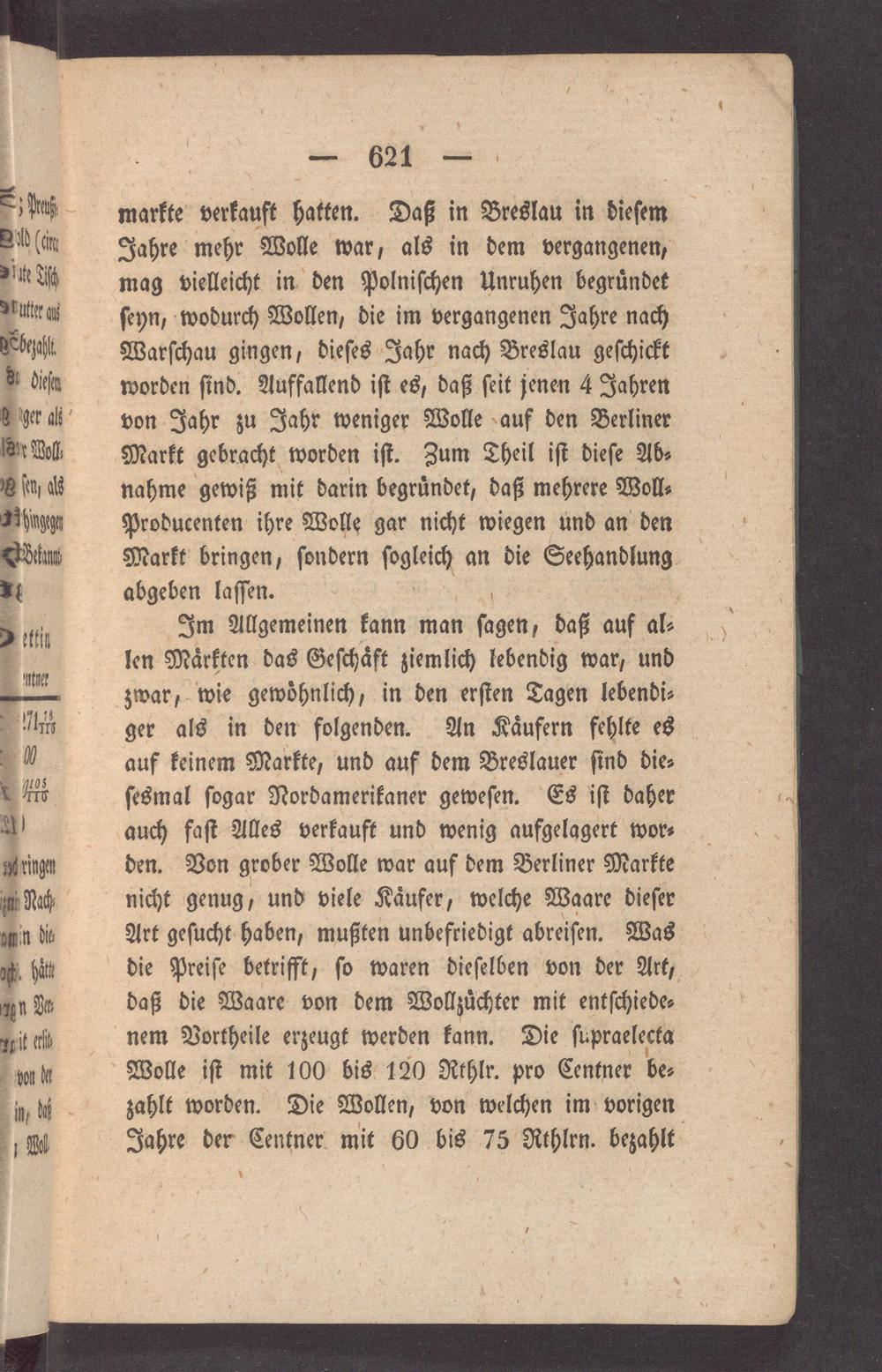 Im Allgemeinen kann man ſagen, daß auf al. len Maͤrkten das Geſchaͤft ziemlich lebendig war, und zwar, wie gewoͤhnlich, in den erſten Tagen lebendi⸗ ger als in den folgenden. An Kaͤufern fehlte es auf keinem Markte, und auf dem Breslauer ſind die⸗ ſesmal ſogar Nordamerikaner geweſen. Es iſt daher auch faſt Alles verkauft und wenig aufgelagert wor⸗ den. Von grober Wolle war auf dem Berliner Markte nicht genug, und viele Kaͤufer, welche Waare dieſer Art geſucht haben, mußten unbefriedigt abreiſen. Was die Preiſe betrifft, ſo waren dieſelben von der Art, daß die Waare von dem Wollzuͤchter mit entſchiede⸗ nem Vortheile erzeugt werden kann. Die ſupraelecta