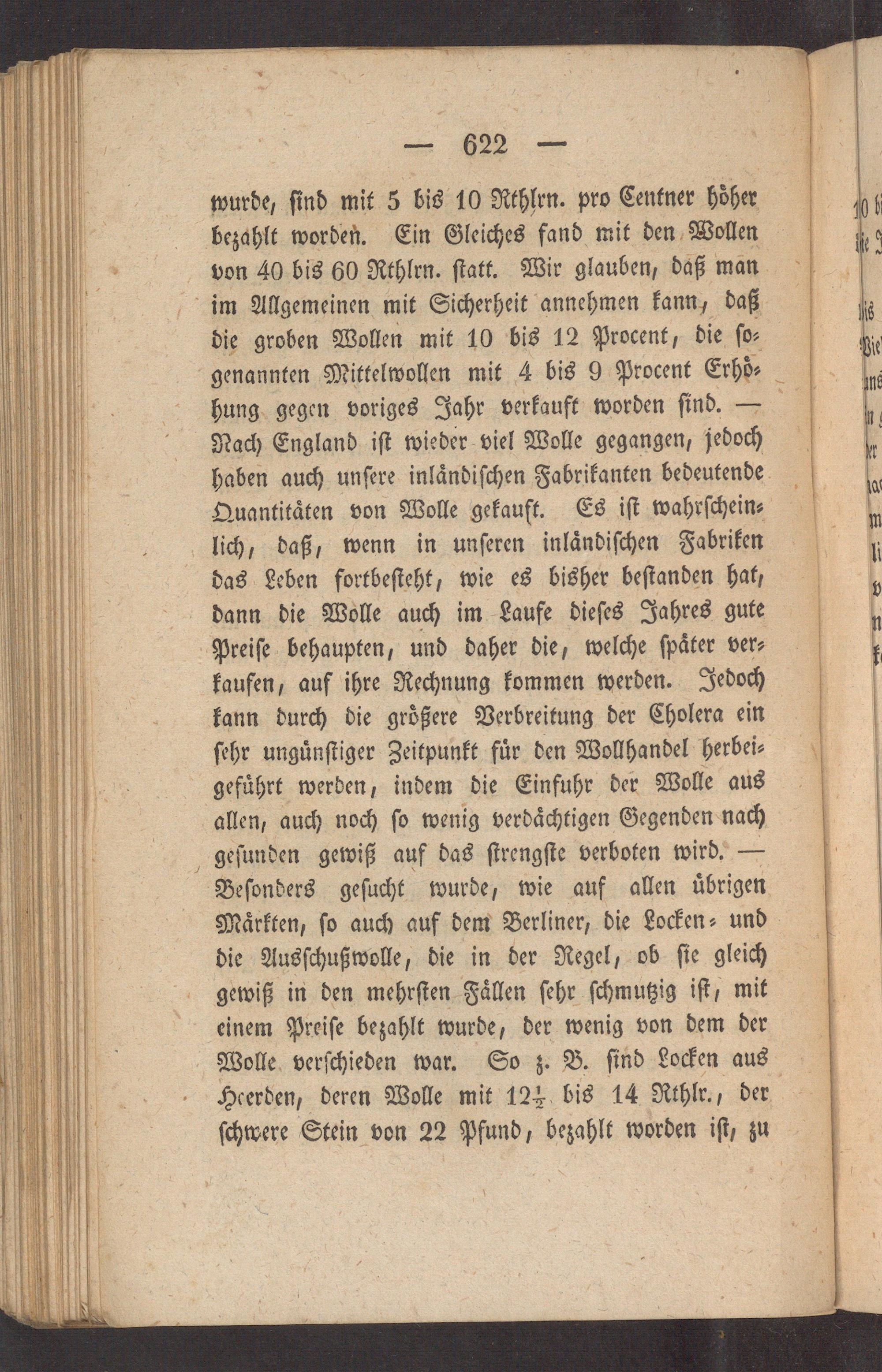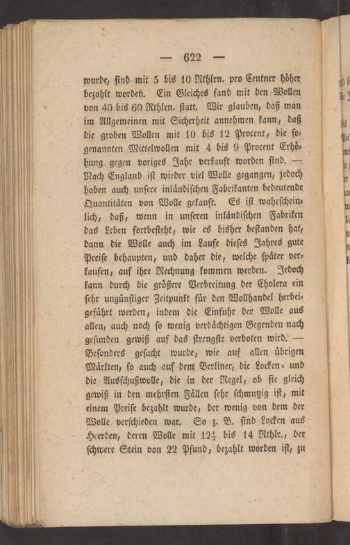 wurde, ſind mit 5 bis 10 Rthlrn. pro Centner hoͤher bezahlt worden. Ein Gleiches fand mit den Wollen von 40 bis 60 Rthlrn. ſtatt. Wir glauben, daß man im Allgemeinen mit Sicherheit annehmen kann, daß die groben Wollen mit 10 bis 12 Procent, die ſo⸗ genannten Mittelwollen mit 4 bis 9 Procent Erhoͤ⸗ hung gegen voriges Jahr verkauft worden ſind. Nach England iſt wieder viel Wolle gegangen, jeboch haben auch unſere inlaͤndiſchen Fabrikanten bedeutende Quantitaͤten von Wolle gekauft. Es iſt wahrſchein⸗ lich, daß, wenn in unſeren inlaͤndiſchen Fabriken das Leben fortbeſteht, wie es bisher beſtanden hat, dann die Wolle auch im Laufe dieſes Jahres gute Preiſe behaupten, und daher die, welche ſpaͤter ver⸗ kaufen, auf ihre Rechnung kommen werden. Jedoch kann durch die groͤßere Verbreitung der Cholera ein ſehr unguͤnſtiger Zeitpunkt fuͤr den Wollhandel herbei⸗ gefuͤhrt werden, indem die Einfuhr der Wolle aus allen, auch noch ſo wenig verdaͤchtigen Gegenden nach geſunden gewiß auf das ſtrengſte verboten wird.— Beſonders geſucht wurde, wie auf allen uͤbrigen Maͤrkten, ſo auch auf dem Berliner, die Locken⸗ und die Ausſchußwolle, die in der Regel, ob ſie gleich gewiß in den mehrſten Faͤllen ſehr ſchmutzig iſt, mit einem Preiſe bezahlt wurde, der wenig von dem der Wolle verſchieden war. So z. B. ſind Locken aus Heerden, deren Wolle mit 12 ½ bis 14 Rthlr., der ſchwere Stein von 22 Pfund, bezahlt worden iſt, zu