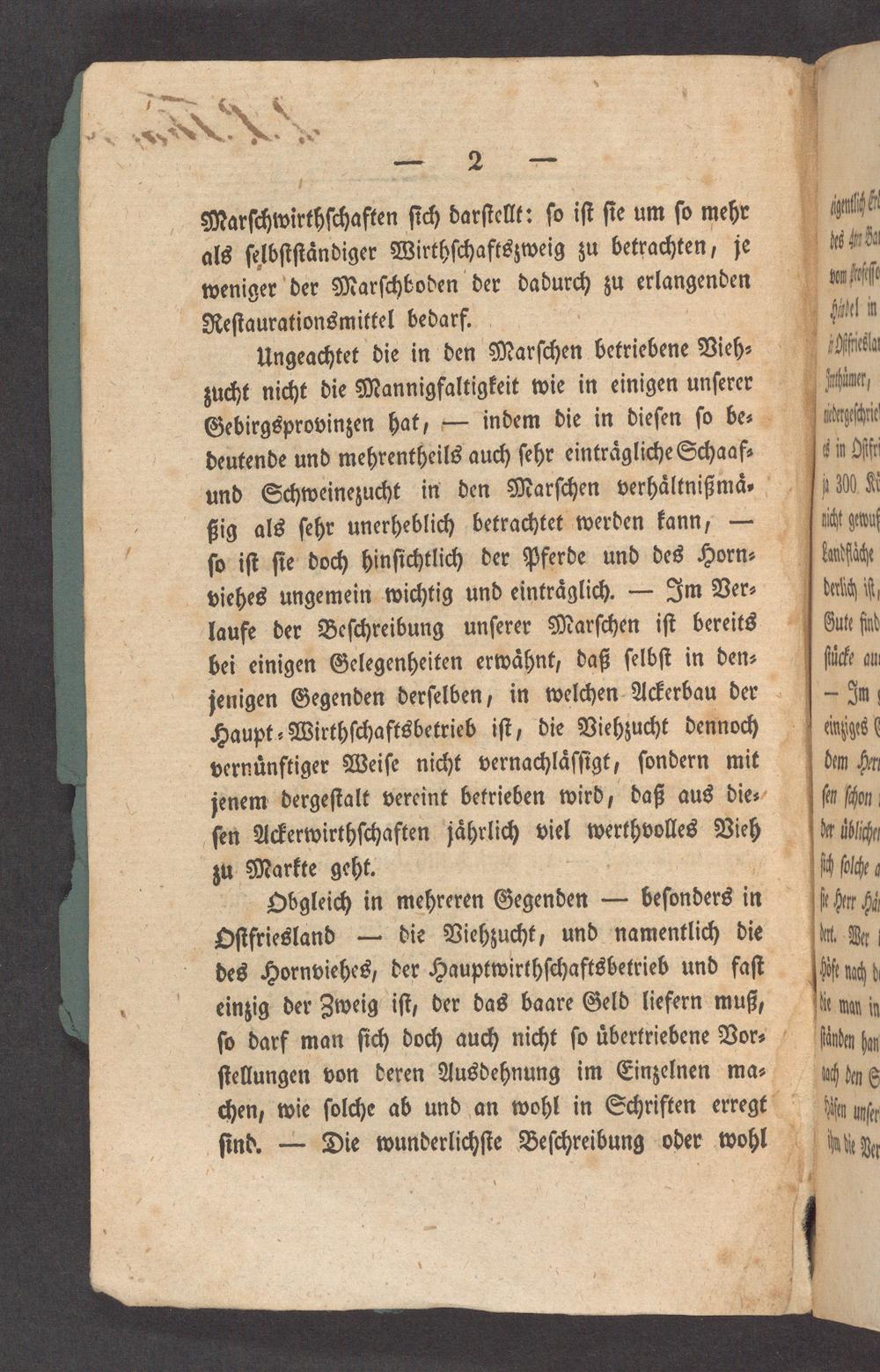 Obgleich in mehreren Gegenden— beſonders in Oſtfriesland— die Viehzucht, und namentlich die des Hornviehes, der Hauptwirthſchaftsbetrieb und faſt einzig der Zweig iſt, der das baare Geld liefern muß, ſo darf man ſich doch auch nicht ſo uͤbertriebene Vor⸗ ſtellungen von deren Ausdehnung im Einzelnen ma⸗ chen, wie ſolche ab und an wohl in Schriften erregt ſind.— Die wunderlichſte Beſchreibung oder wohl
