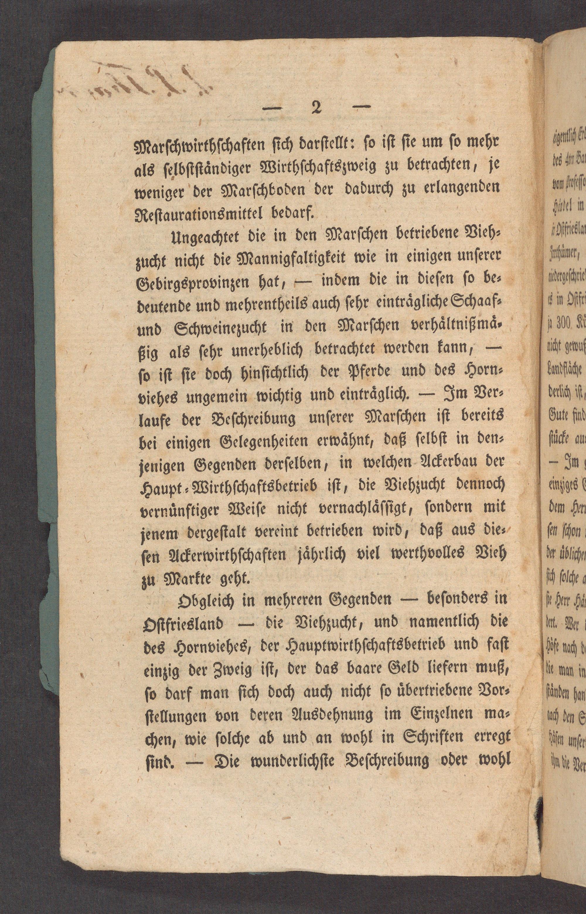 Ungeachtet die in den Marſchen betriebene Vieh⸗ zucht nicht die Mannigfaltigkeit wie in einigen unſerer Gebirgsprovinzen hat,— indem die in dieſen ſo be⸗ deutende und mehrentheils auch ſehr eintraͤgliche Schaaf⸗ und Schweinezucht in den Marſchen verhaͤltnißmaͤ⸗ ßig als ſehr unerheblich betrachtet werden kann,— ſo iſt ſie doch hinſichtlich der Pferde und des Horn⸗ viehes ungemein wichtig und eintraͤglich.— Im Ver⸗ laufe der Beſchreibung unſerer Marſchen iſt bereits bei einigen Gelegenheiten erwaͤhnt, daß ſelbſt in den⸗ jenigen Gegenden derſelben, in welchen Ackerbau der Haupt⸗Wirthſchaftsbetrieb iſt, die Viehzucht dennoch vernuͤnftiger Weiſe nicht vernachlaͤſſigt, ſondern mit jenem dergeſtalt vereint betrieben wird, daß aus die⸗ ſen Ackerwirthſchaften jaͤhrlich viel werthvolles Vieh zu Markte geht.
