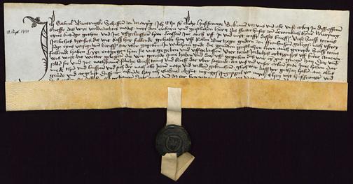 Schöffe Gabriel Breitrück zu Marburg und seine Frau Else geben den geistlichen Herren des Fraterhauses zum Löwenbach in Marburg einen Zins von 6 Turnosen auf den Gütern des Ruel Buerzieg zu Fronhausen, an denen diese schon 6 Turnosen haben, zusammen mit der zugehörigen Urkunde ...