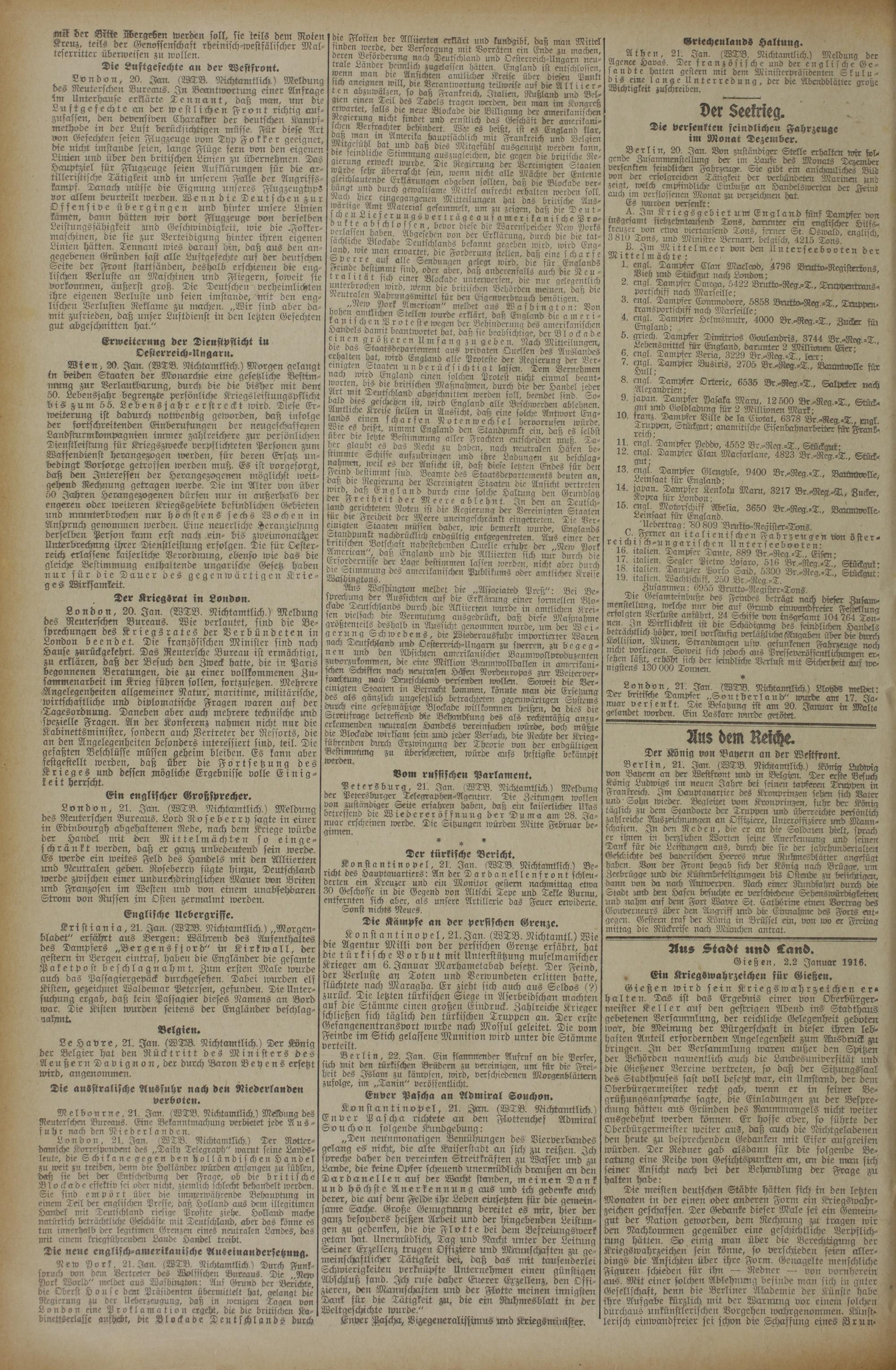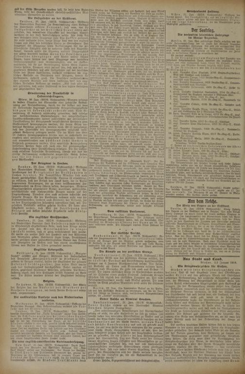 Konstantinopel, 21. Jan. (WTB. Nichtamtlich.) Bericht des Hauptquartiers: An der D a r d a n e l l e n f r o n t schleuderten ein Kreuzer und ein Monitor gestern nachmittag etwa 30 Geschosse in die Gegend von Altschi Tepe und Tekke Burnu, entfernten sich aber, als unsere Artillerie das Feuer erwidette.