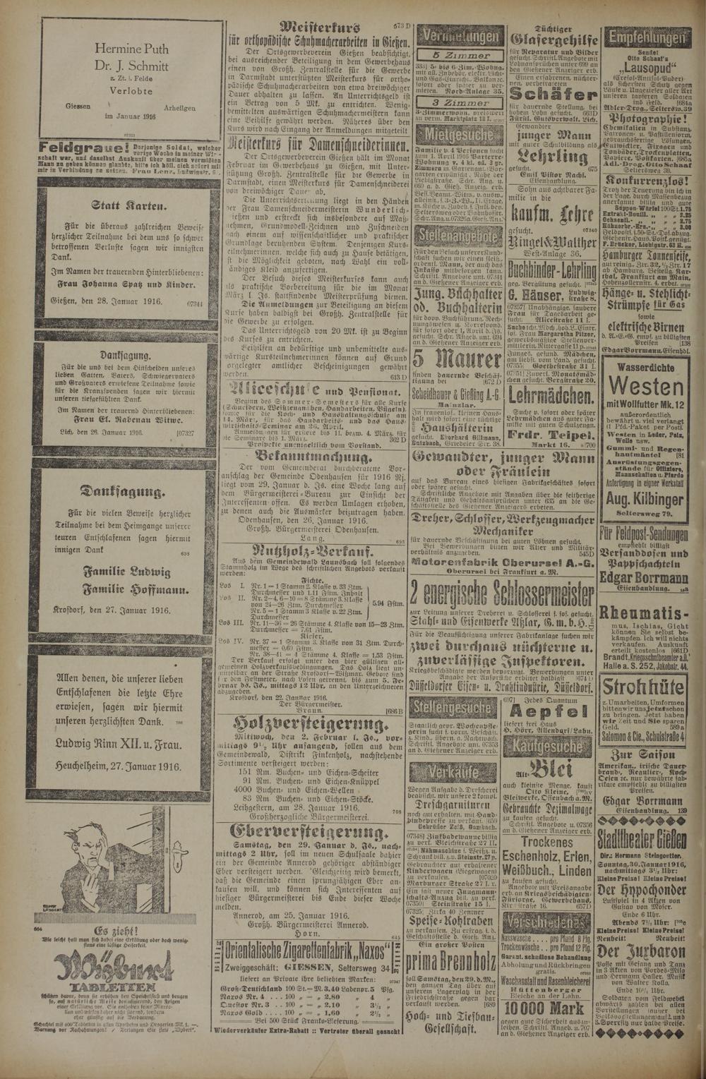 Der vom Gcmeinderat dnrchberatene Vor anschlag der Gemeinde Odenhausen für 1916 Nj liegt vom 29. Januar d. Js. eine Woche lang au dem Bürgermeisterei-Bureau zur Einsicht der Interessenten offen. Es werden Umlagen erhoben zu denen auch die Ausmärker beizutragen haben Odenhausen, den 26. Januar 1916.