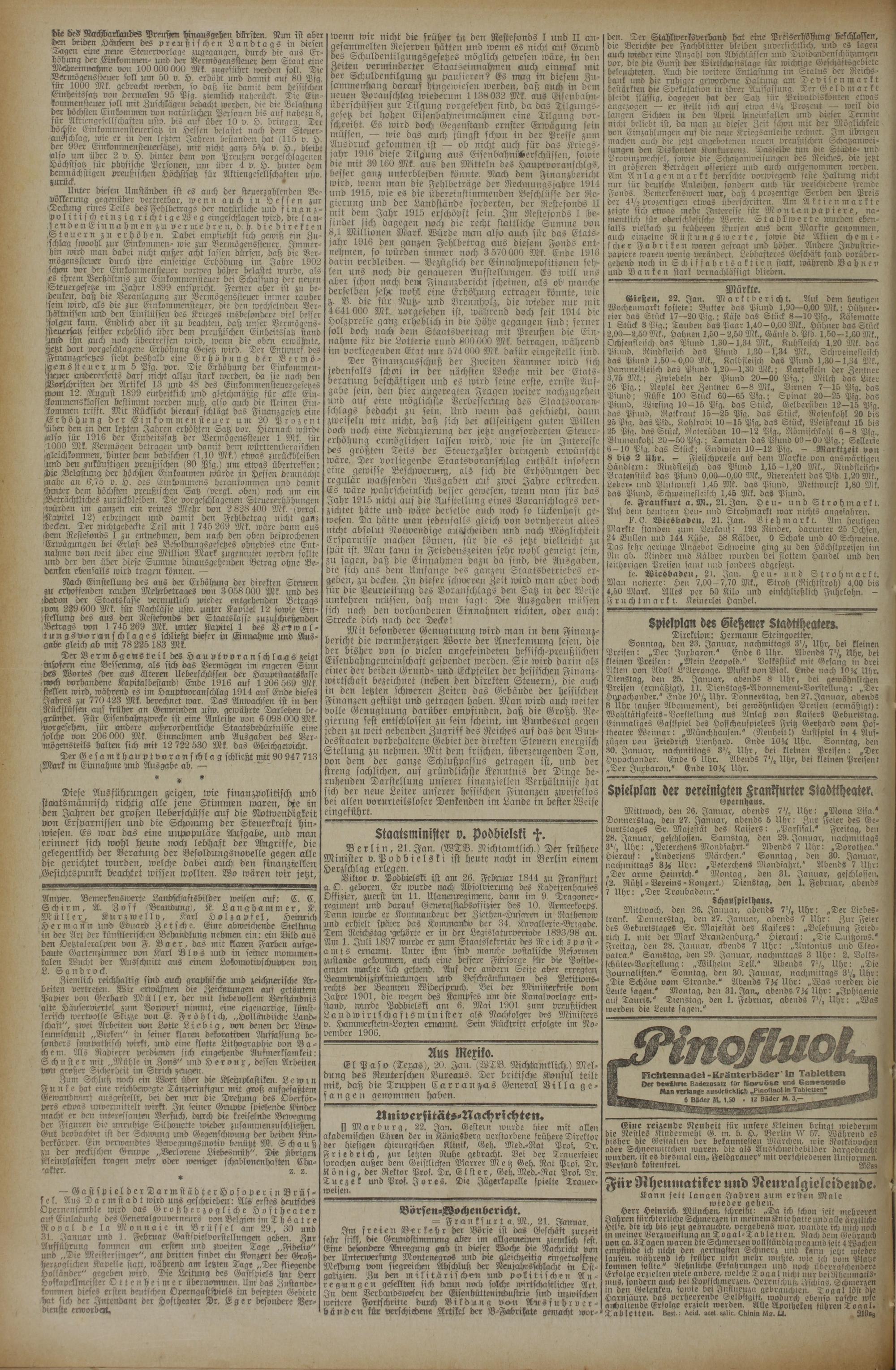 Mit besonderer Genugtuung wird man in dem Finanzbericht die warmherzigen Worte der Anerkennung lesen, die her bisher von so vielen angefeindeten hessisch-preußischen Eisenbahngemeinschaft gespendet werden. Sie wird darin als einer der beiden Grund- und Eckpfeiler der hessischen Finanzwirtschaft bezeichnet (neben den direkten Steuern), die auch in den letzten schweren Zeiten das Gebäude der hessischen Finanzen gestützt und getragen haben. Man wird auch weiter volle Genugtuung darüber empfinden, daß die Großh. Regierung fest entschlossen zu sein scheint, im Bundesrat gegen jeden zu weit gehenden Zugriff des Reiches auf das den Bundesstaaten vorbehaltene Gebiet der direkten Steuern energisch Stellung zu nehmen. Mit dem frischen, überzeugenden Ton, von dem der ganze Schlußpassus getragen ist, und der 'treng sachlichen, auf gründlichste Kenntnis der Dinge beruhenden Darstellung unserer finanziellen Verhältnisse hat ich der neue Leiter unserer hessischen Finanzen zweifellos bei allen vorurteilsloser Denkenden im Lande in bester Weise eingeführt.