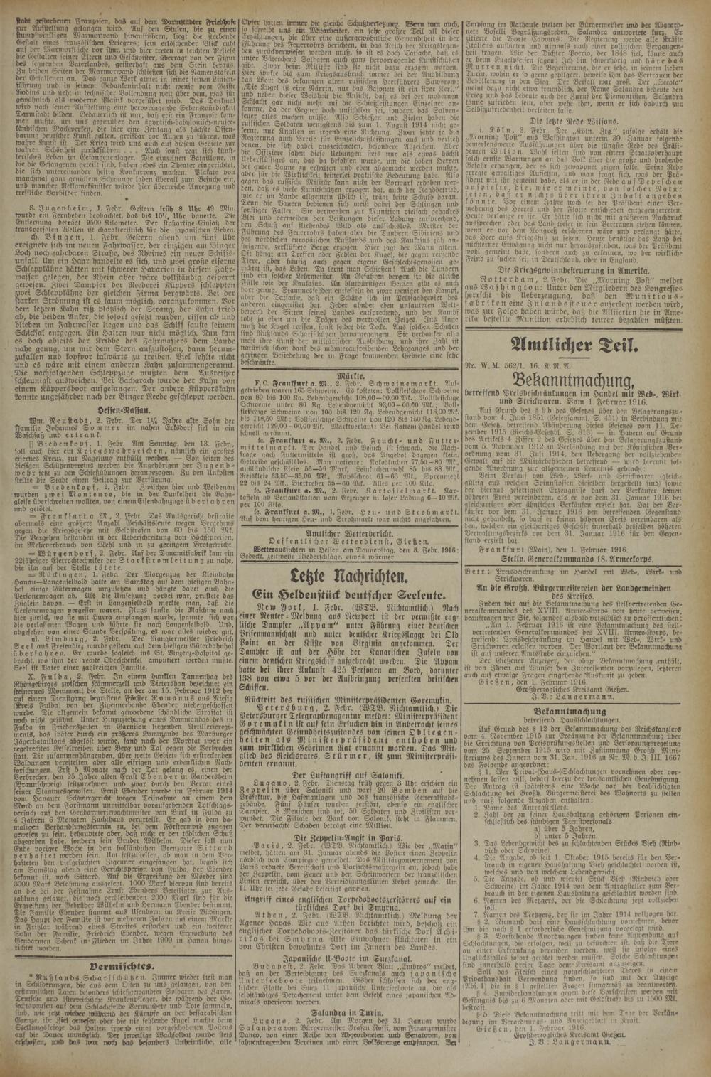 Oeffentlicher Wetterdien st, Gießen. Wetteraussichten :n Dessen am Donnerstag, den 3. Febr. 1916: Bedeckt, zeitweise Niederschläge, euvas wärmer _