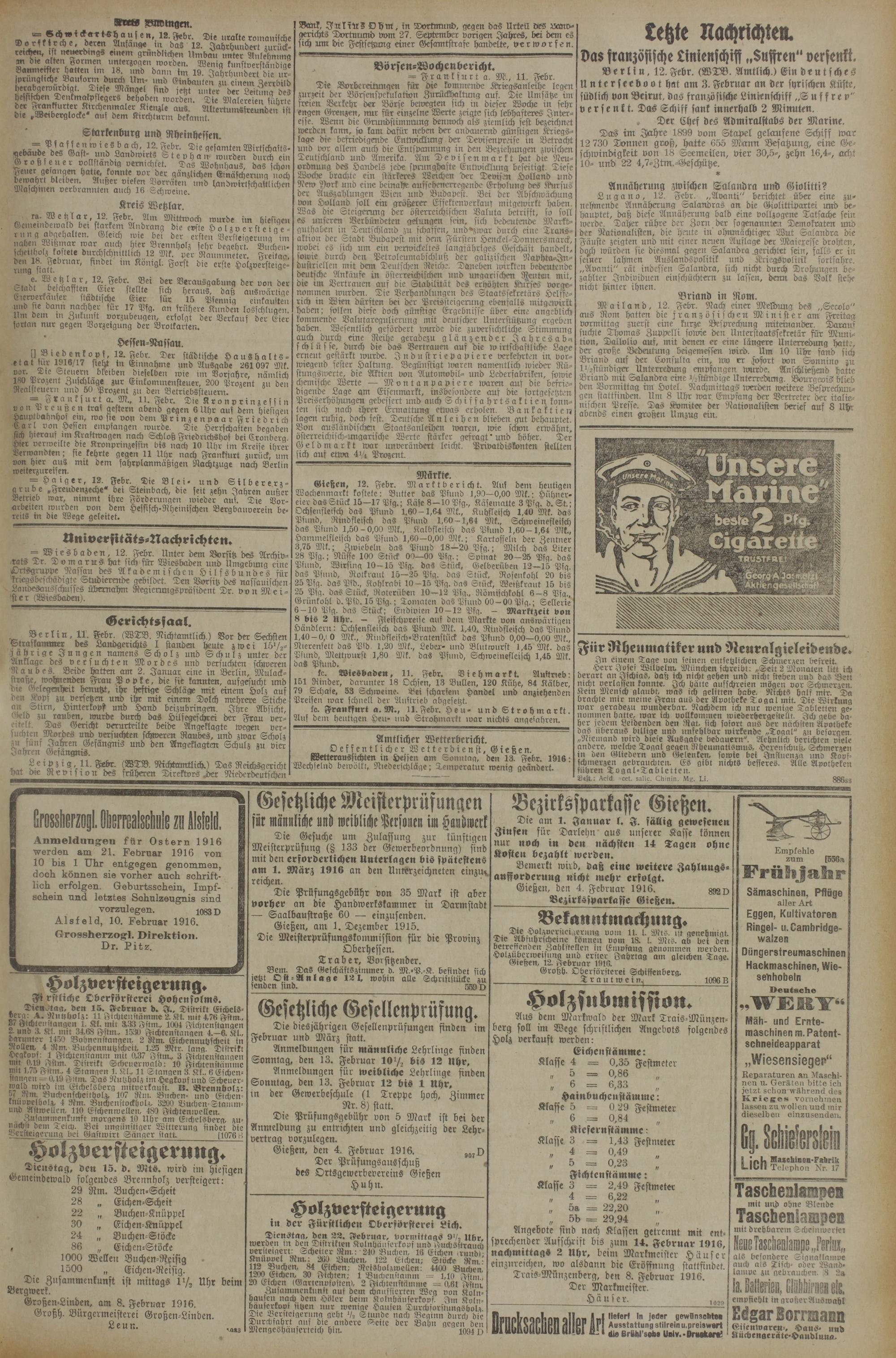 O e f f e n t l i ch e r Wetterdienst, Gießen. Wetteraussichten in Hessen am Sonntag, den 13. Febr. 1916: Wechselnd bewölkt, Niederschläge; Temperatur wenig geändert.
