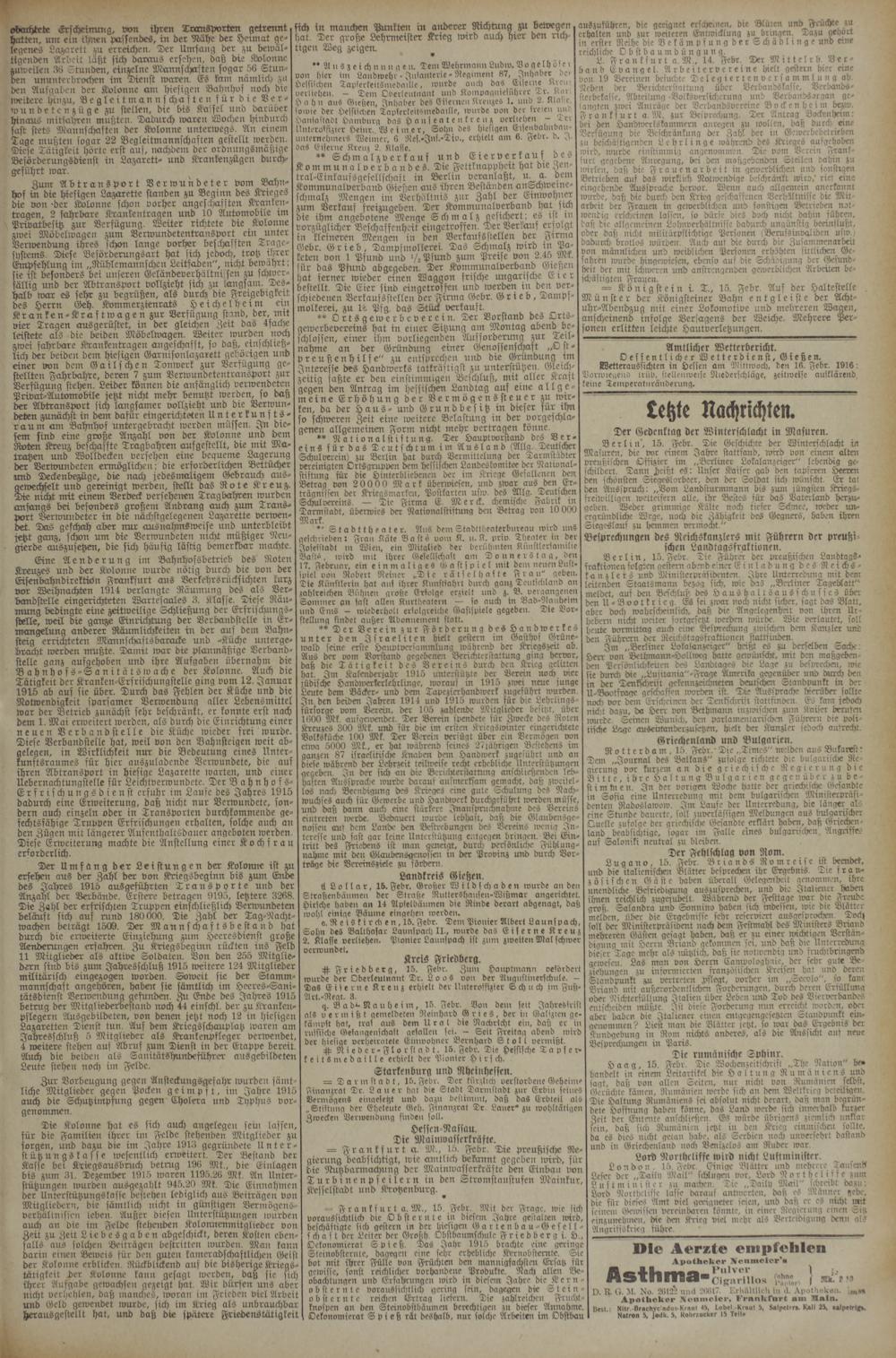 Oessentlicher Wetterdien st, Gießen. Wetteraussichten in Hessen am 'Mittwoch, den 16. Febr. 1916: Vorwiegend trüb, stellenweise Niederschläge, zeitweise ausklärend, keine Temperatnränderung.
