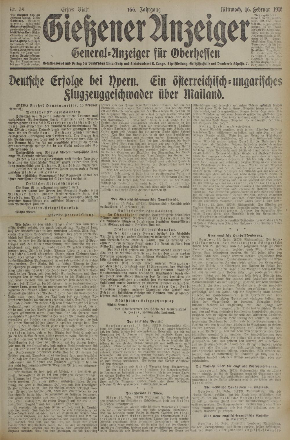 Wien, 15. Febr. (WTV. Nichtamtlich.) Amtlich wird verlautbart: 15. Februar 1916.