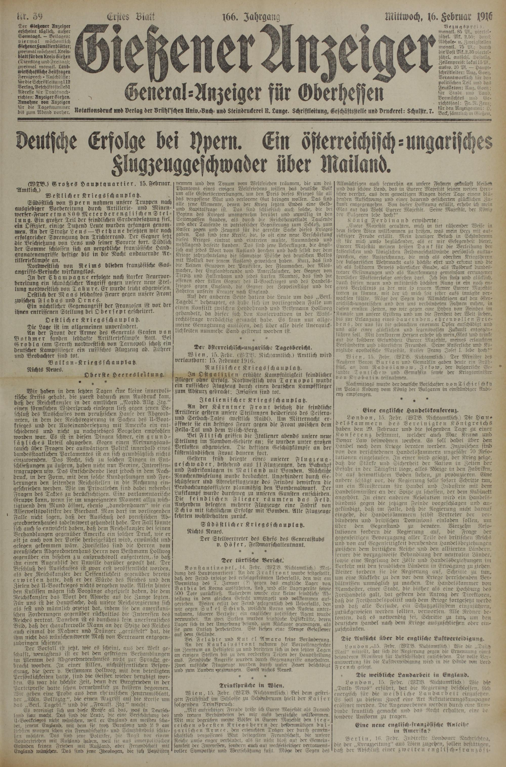 Gestern früh belegte eines unserer Flugzeug- geschwader, bestehend ans 11 Flugzeugen, den Bahnhof und Fabrikanlagen in Mailand mit Bomben. Mächtige Rauchentwickelung wurde beobachtet. Ungehindert durch Geschützfeuer und Abwehrflugzeuge des Feindes bewirkten die Beobachtungsoffiziere planmäßig den Bombenabwurf. Der Luftkampf wurde durchweg zu unseren Gunsten entschieden. Die feindlichen Flieger räumten das Feld. Außerdem belegten mehrere Flugzeuge eine Fabrik von Sch io mit sichtlichem Erfolge mit Bomben. Alle Flugzeuge kehrten wohlbehalten zurück.