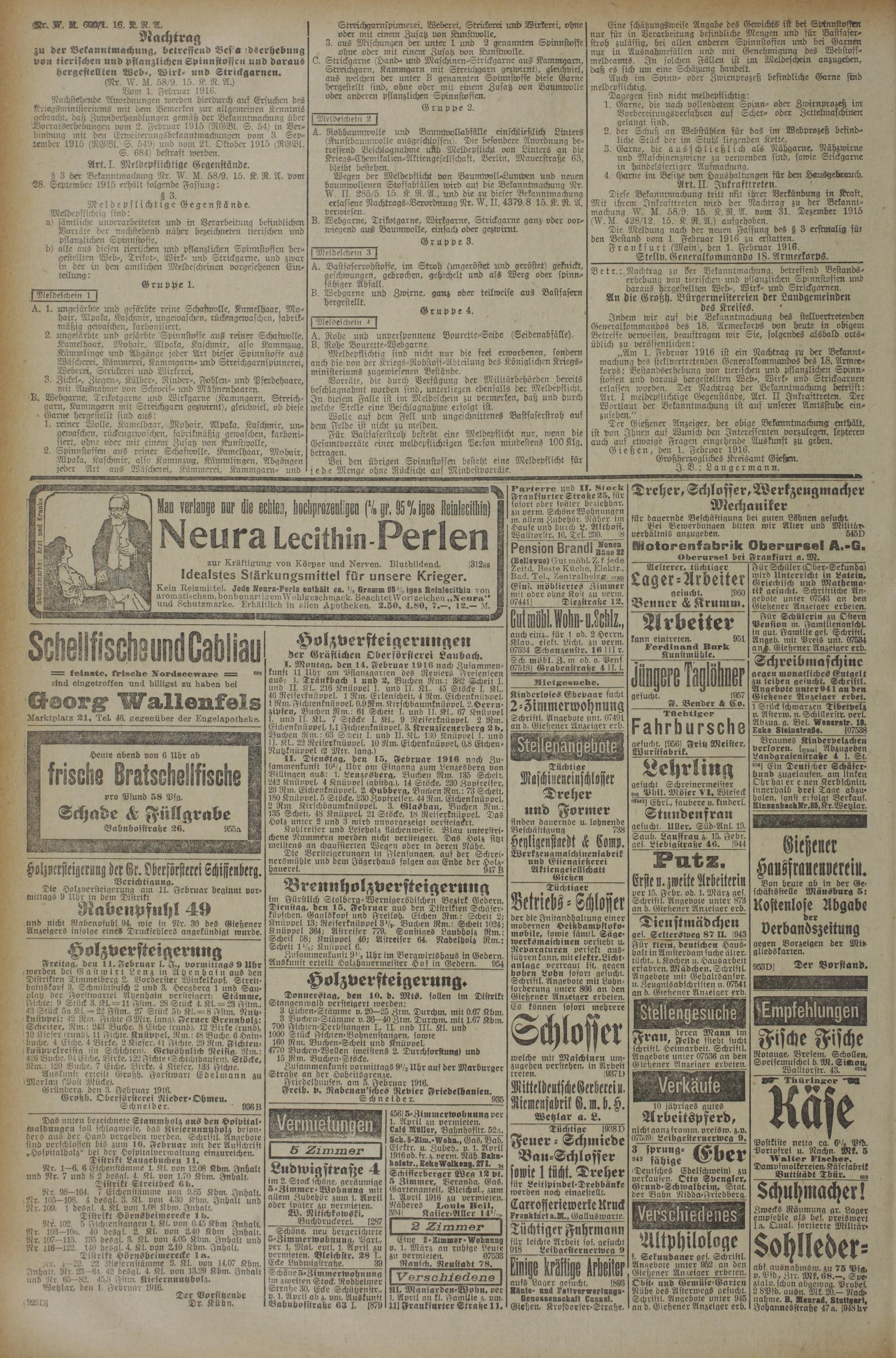 „Am 1. Februar 1916 ist ein Nachtrag zu der Bekanntmachung des stellvertretenden Generalkommandos des 18. Armeekorps: Bestandserhebung von tterischen und pflanzlichen Spinnstoffen und daraus hergestellten Web-, Wirk- und Strickgarnen erlassen worden. Der Nachtrag der Bekanntmachung betrifft: Art. I meldepflichtige Gegenstände, Art. II Jnkrafttteten. Der Wortlaut der Bekanntmachung ist auf unserer Amtsstube einzusehen."