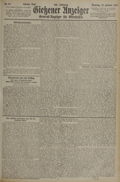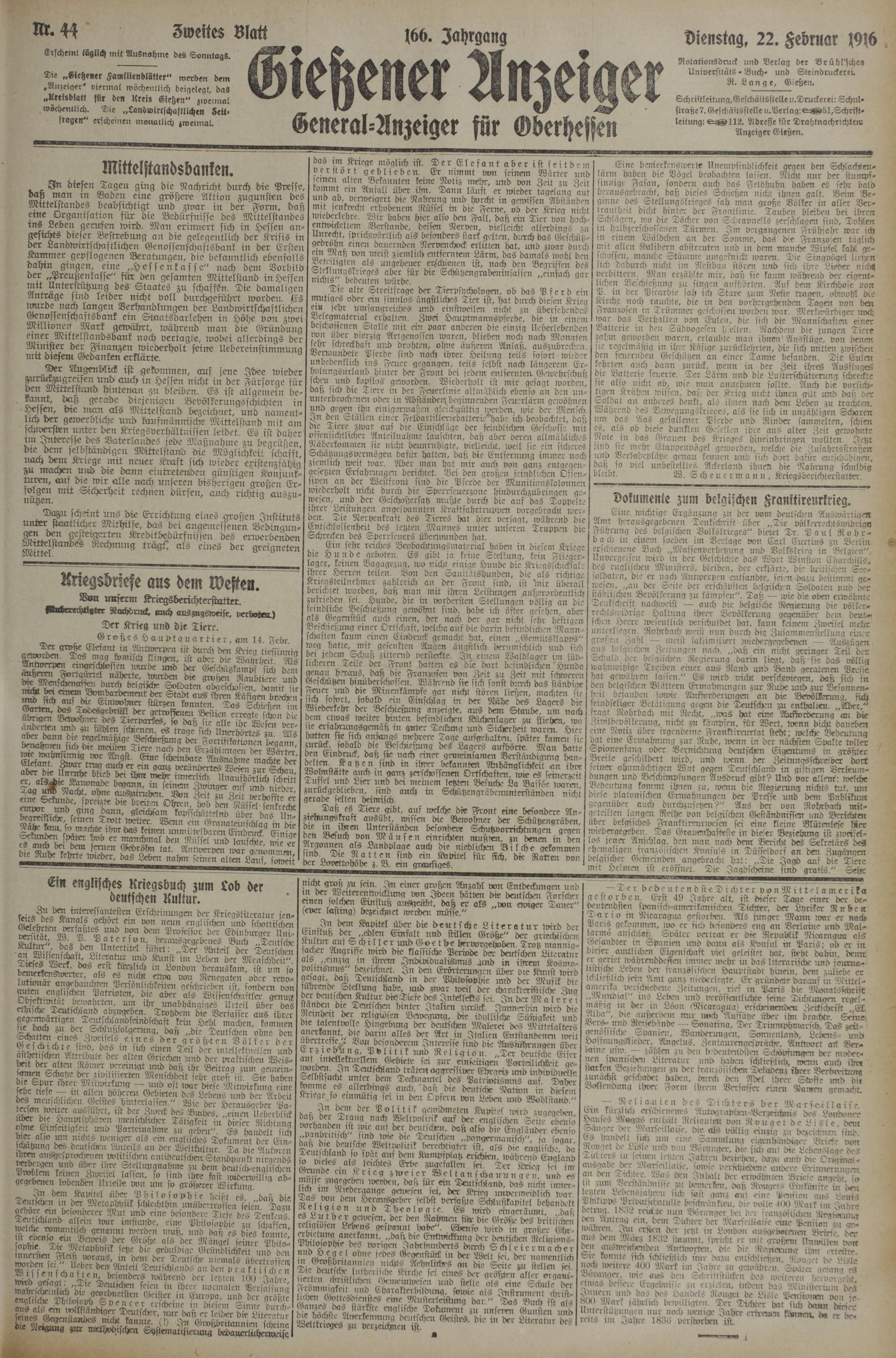 Schristleitung,Geschäftsstelle u.Druckerei: Schulstraße?. Geschäftsstelle lt.Verlag: ^^51,Schriftleitung: ^^112. Adresse für Drahtnachrichten: Anzeiger Gießen.